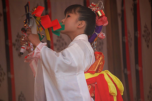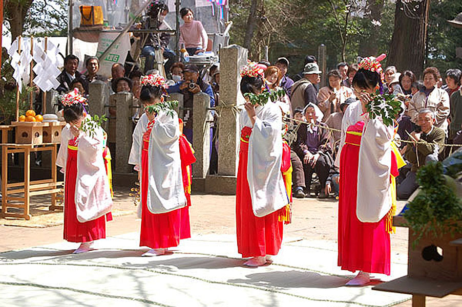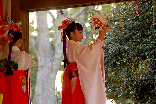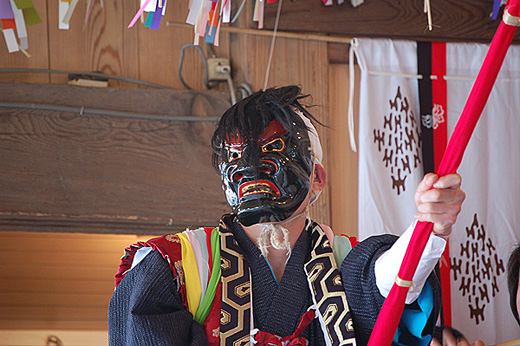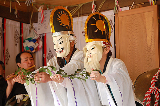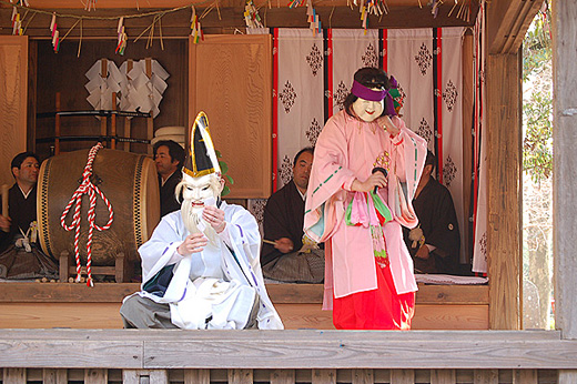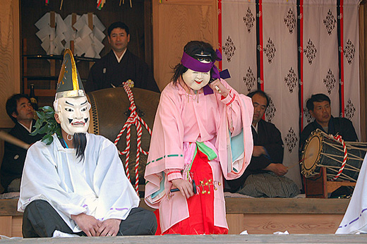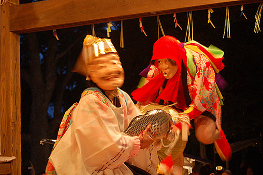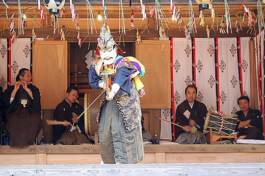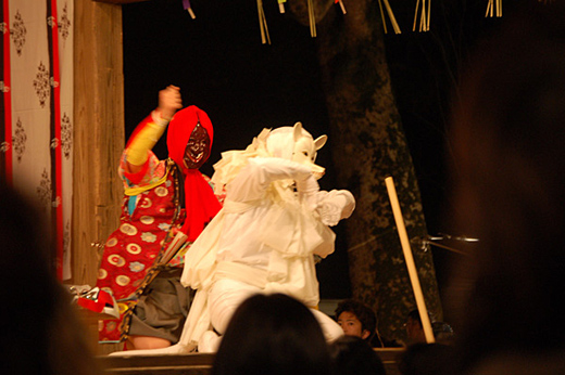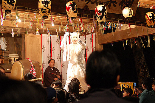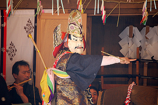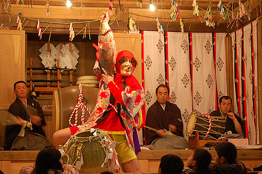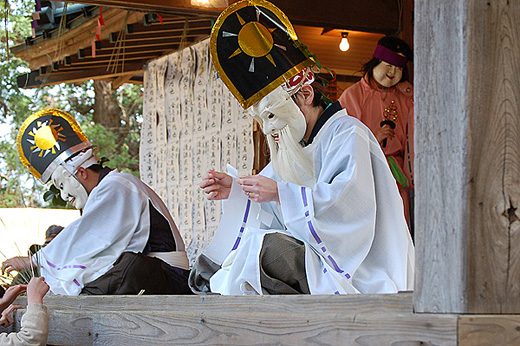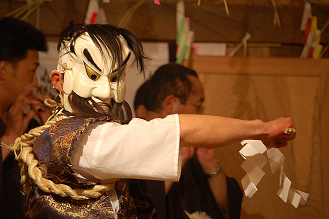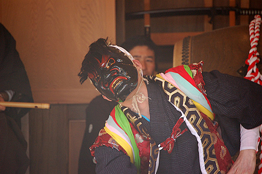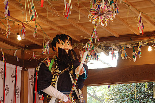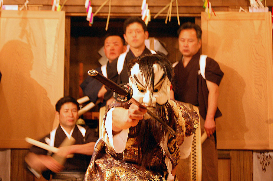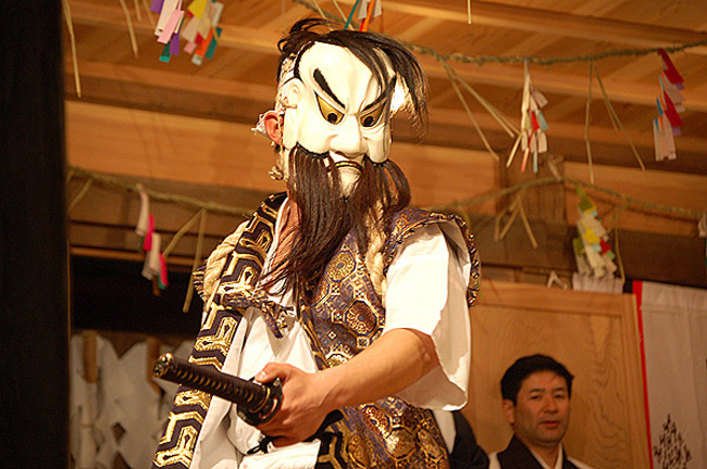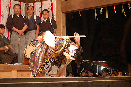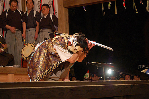 素盞鳴尊の舞いのクライマックスは、八岐の大蛇に見立てた天井のしめ縄が静かに下りてくる処を、神剣(真剣) で切り落とします。瞬くまもなく大勢の見物客が、縁起物のしめ縄を目指して一斉に神楽殿に殺到します。