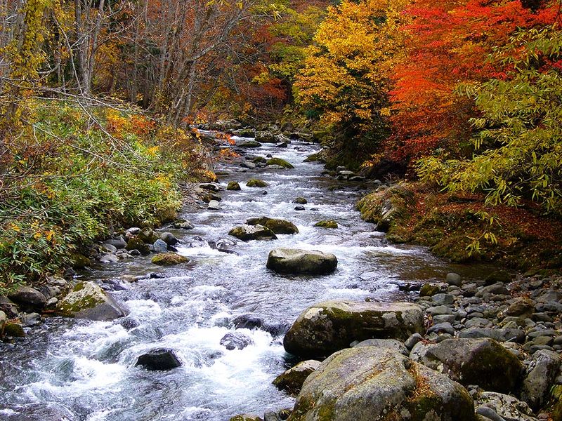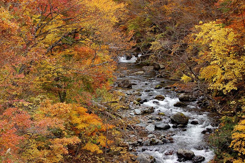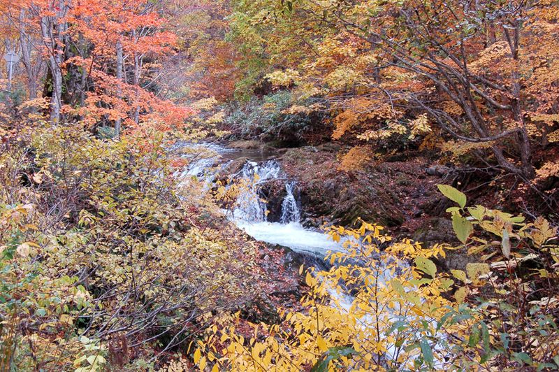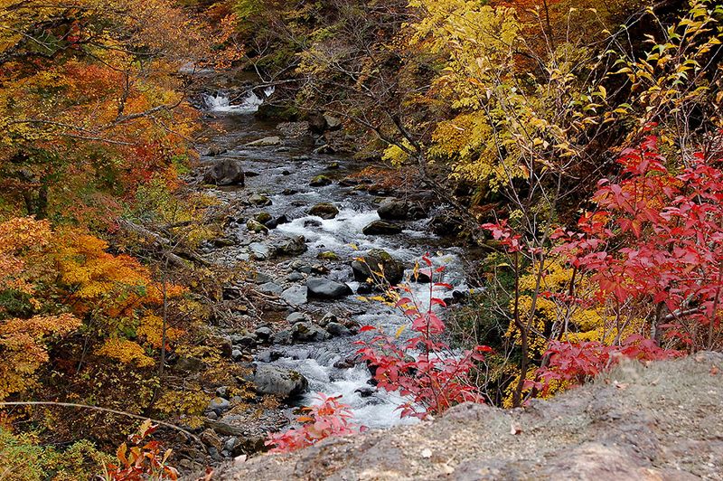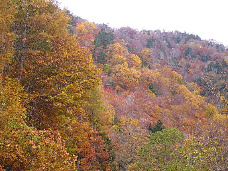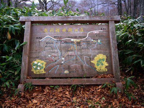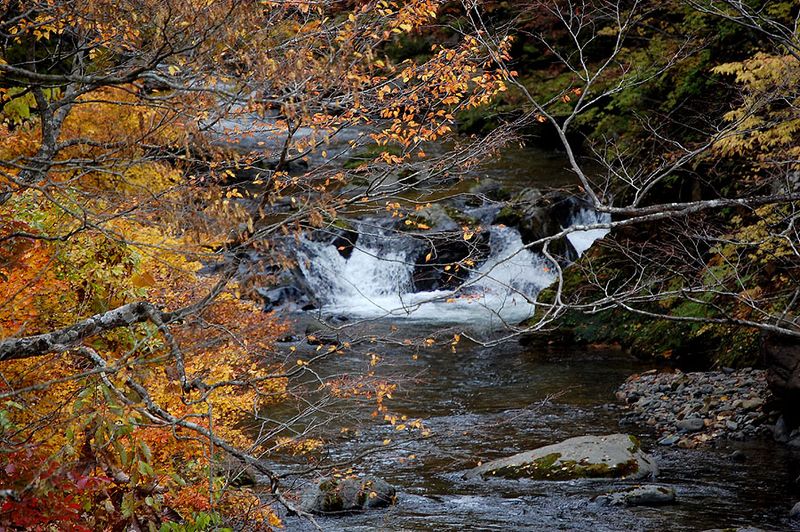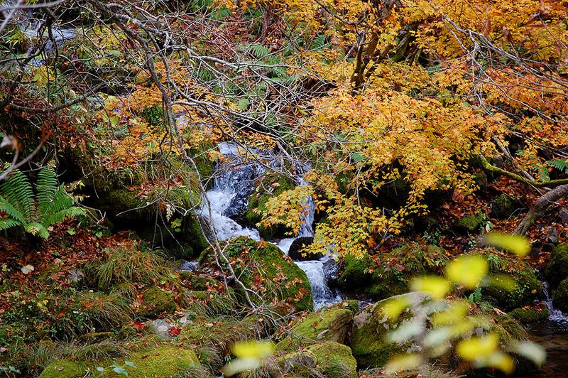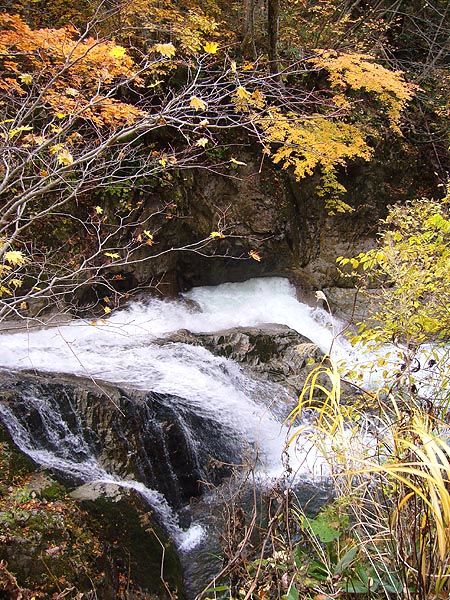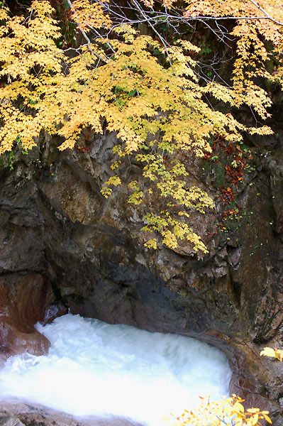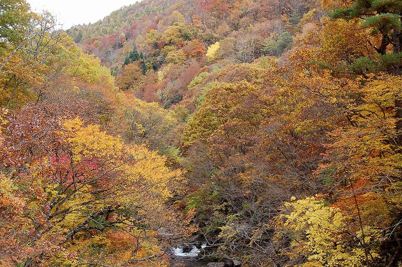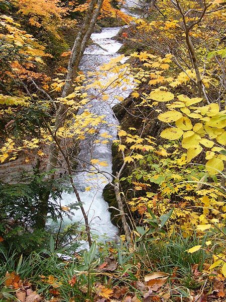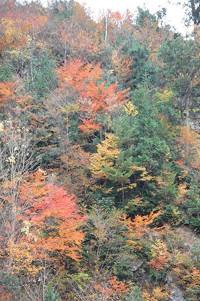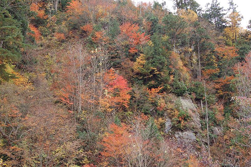途中いくつもの撮影ポイントがありましたが、道路が狭い上時間的にも余裕が無く、存分に撮影することは出来ま せんでした。高度を上げる毎に紅葉は減少し、落葉ばかりが目立つようになりました。坤六峠から尾瀬・鳩待峠へ の分岐点津奈木の間では落葉松の黄葉が輝くような場所がありましたが、駐車出来ずに撮影は諦めました。
