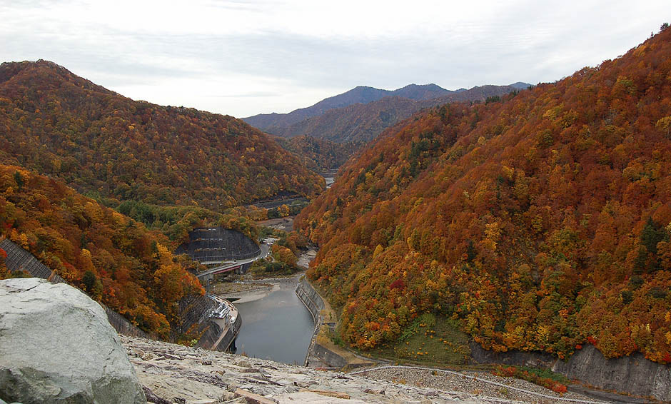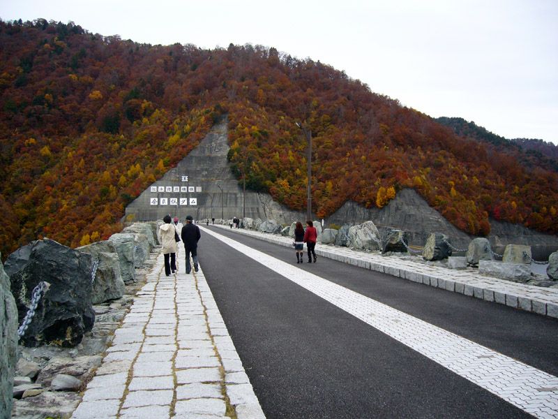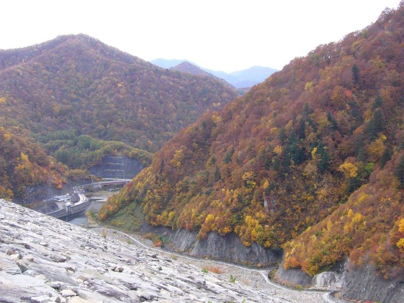紅葉を楽しみながら遊歩道の長い石段を上り、奈良俣サービスセンターで一息入れました。ここで昼食のきのこ 弁当とお茶を購入して、今来た道を戻ることにします。ダム上からは、湖の右手に尾瀬の至仏山・悪沢岳・笠ヶ 岳を見ることが出来ました。