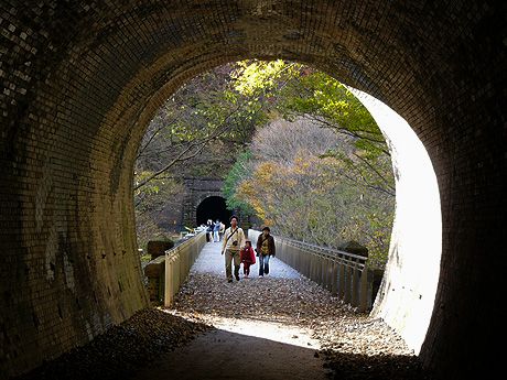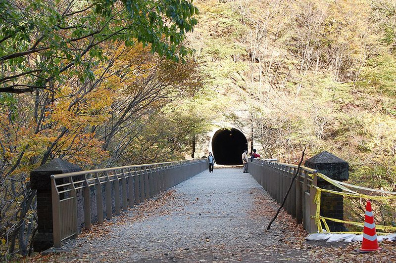 碓氷峠からは旧道の別荘地を通り、国道18号線(旧道)を横川へと進みましたが、途中旧信越本線の碓氷第3 アーチに立ち寄りました。明治時代に建造された国指定重要文化財だそうです。遊歩道になっている第3アーチ 上に上り、第5トンネルの中にも入ってみました。