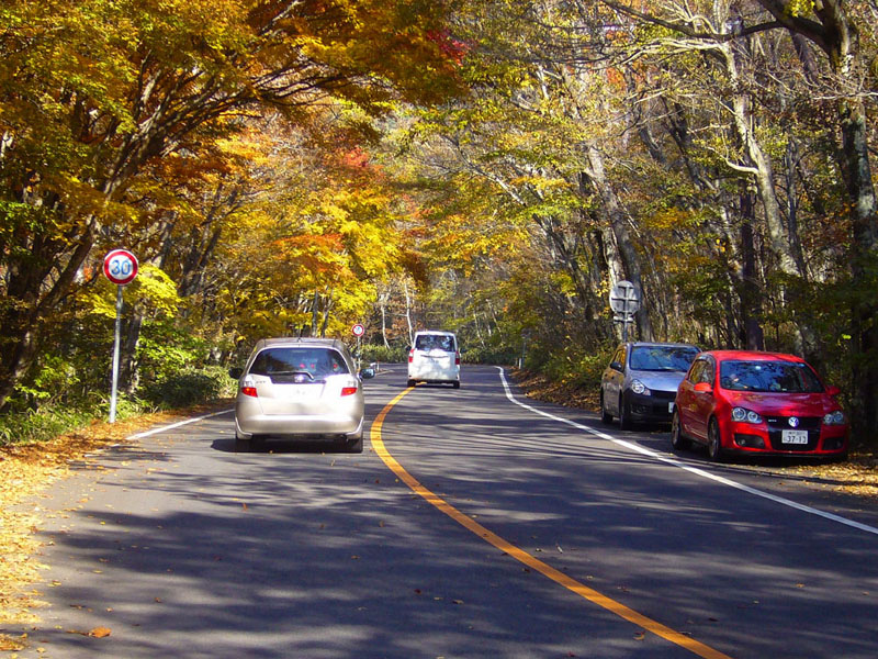 紅葉シーズンを迎え、箒川ダムからの道は渋滞でのろのろ運転を余儀なくされました。また日塩もみじラインに 入ると、紅葉がピークを迎えており、駐車スペースは何処も満車状態です。塩原側のゲート(有料入口)付近で は見事な紅葉がありましたが、やむなく素通りして白滝まで進むことになりました。