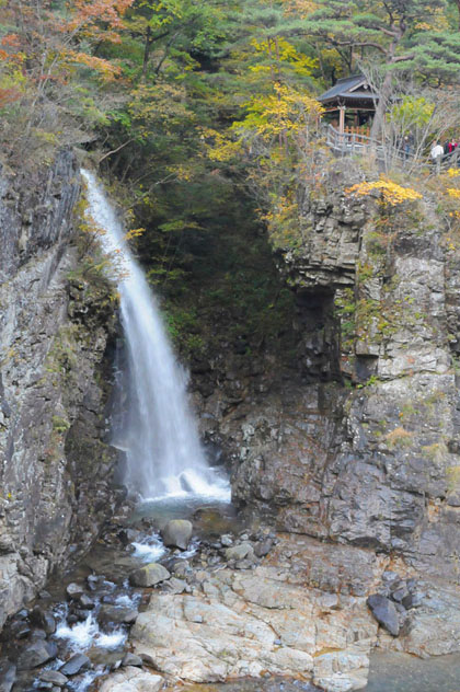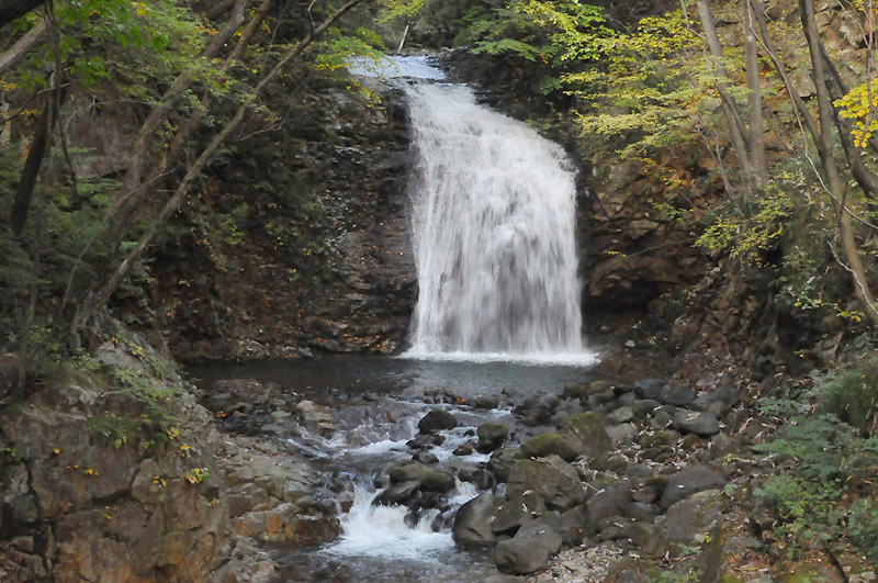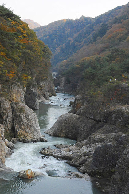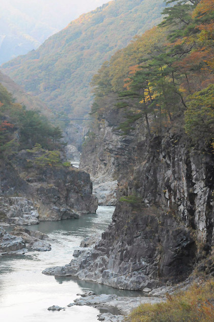 竜王峡の散策は白岩バス停から遊歩道へと下り、むささび橋を渡って対岸を虹見橋に向かって進みました。虹見橋 を渡って竪琴の滝に立ち寄った後は、往路と反対側の遊歩道をむささび橋へと戻り、少し暗くなりかけた道を白岩 バス停へと急ぎます。竜王峡の散策を終え、車を走らせる頃には日も暮れかけ、ライトを灯す頃になってしまいま した。