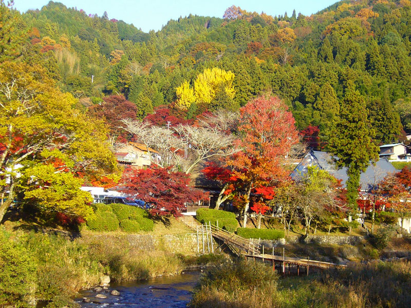 ら、対岸の紅葉を眺めながら待月橋へ進みます。橋を渡り、栗乃木茶屋から三州足助屋敷を