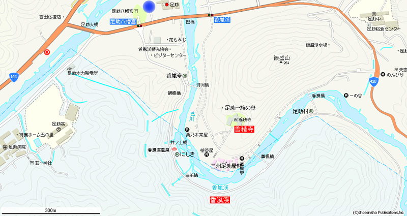 香嵐渓マップ・・・宮内の駐車場でバスを降り、土産物店の並ぶ道を巴川沿いの遊歩道に向かいました。ここか
