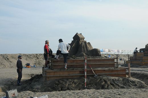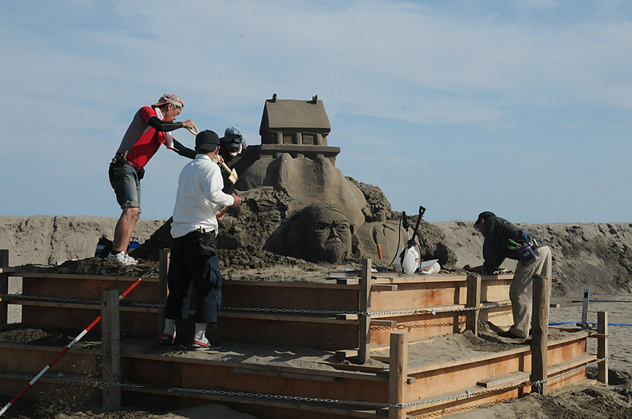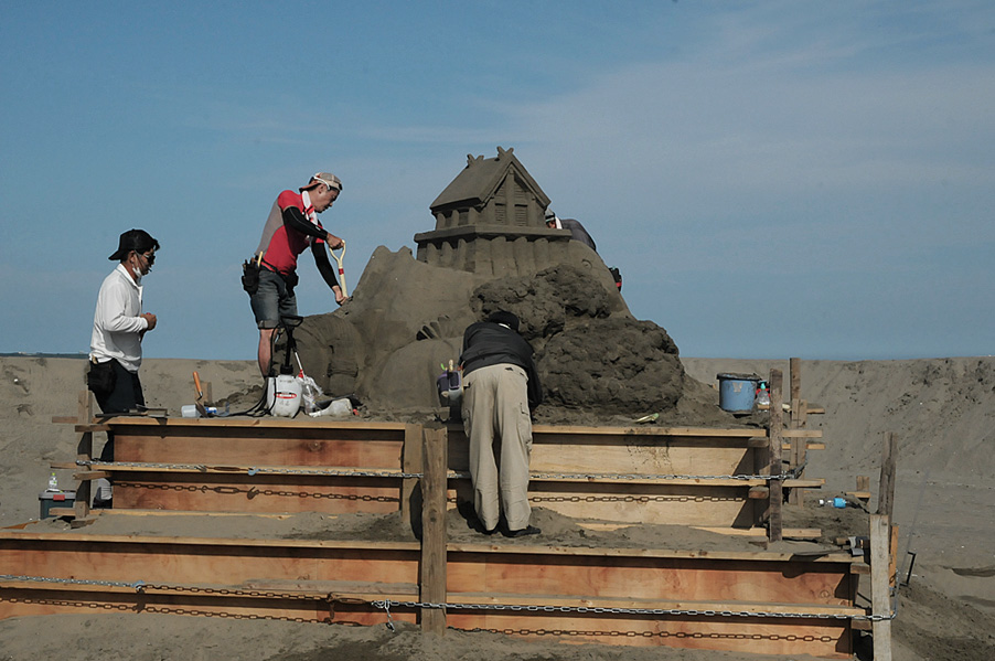 12日に会場入りされた尾張砂像連盟の皆さん。午後から訪ねてみると、既に製作が進んでいました。