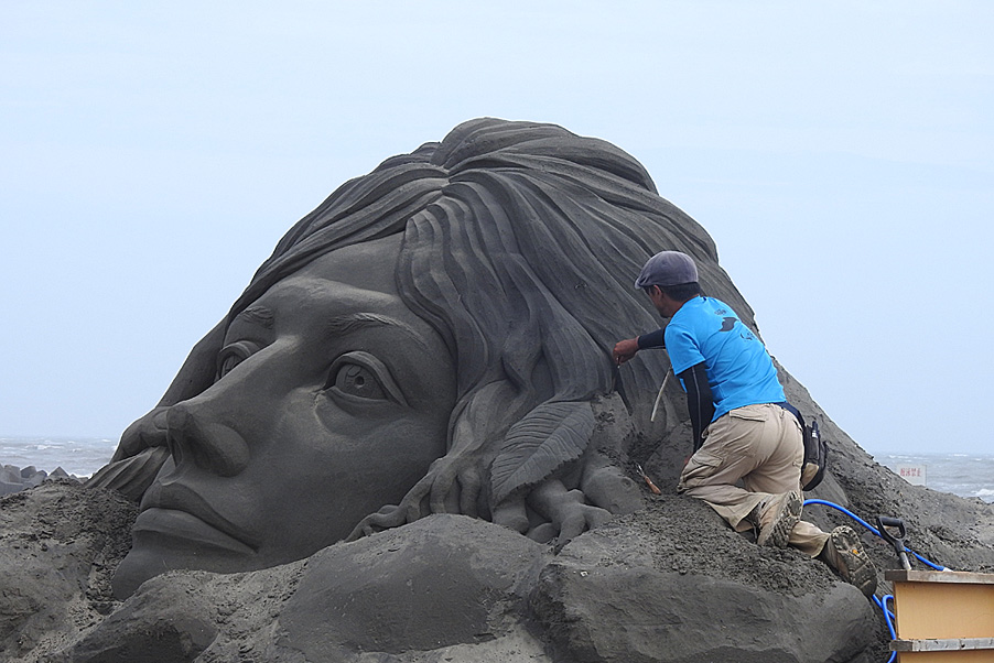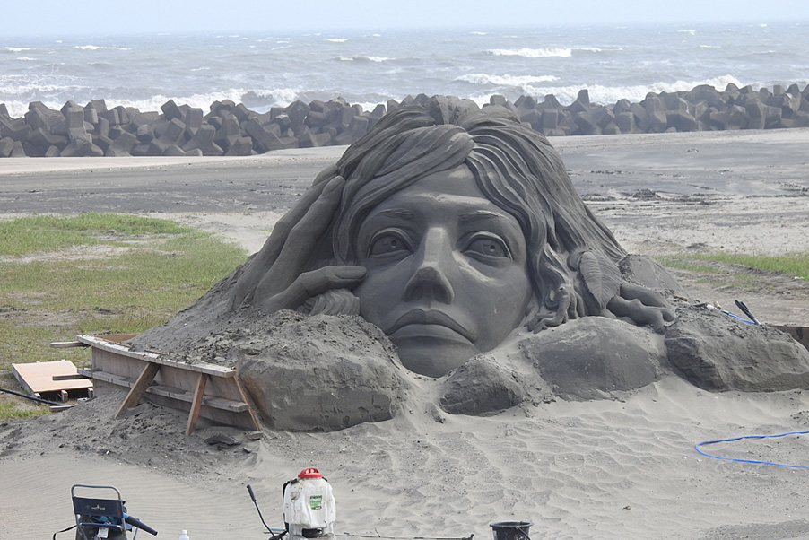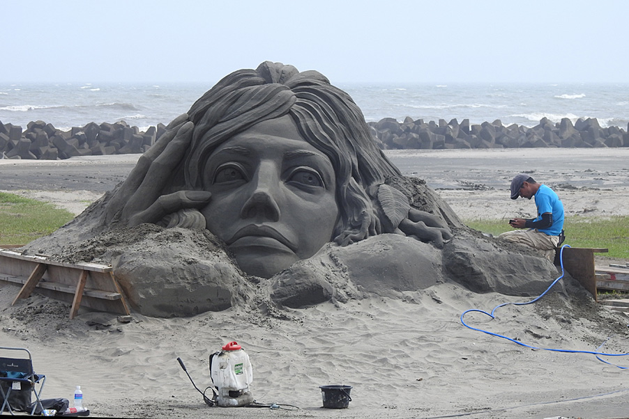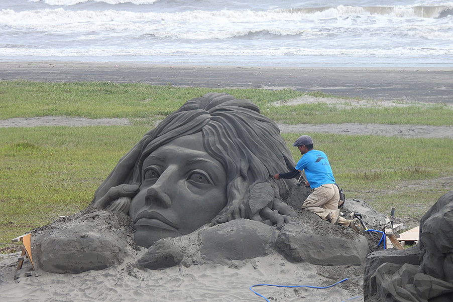 夕方から風が強くなり、製作中の砂像にも細かい砂が薄っすらと積もってきました。