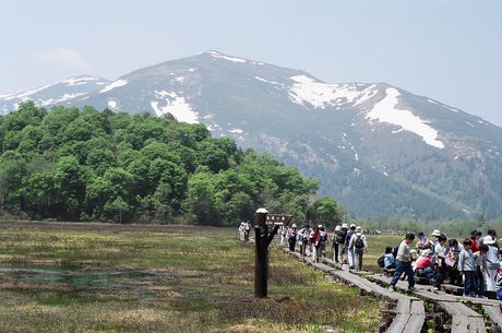 ◎三又の分岐点では、多くのハイカーがベンチで休息して、尾瀬を堪能していた。