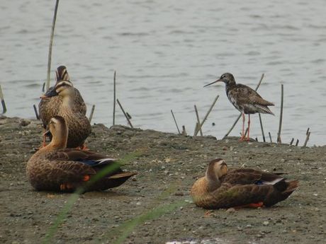 ツルシギとカルガモ