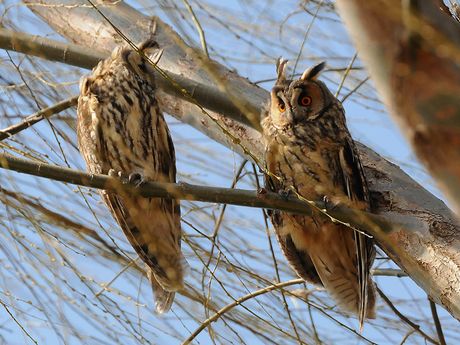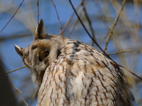 今日は、昨日の予定から落ちた東京多摩川のトラフズクを訪ね、帰路に葛西臨海公園に立ち寄ってギンムクドリを 探すことにしました。多摩川到着は比較的に早かったものの、場所を誤ったために1時間以上探すことになってし まいました。現地は多摩川の河川敷で、野球練習場の直ぐ脇にありましたが、多くの人が居てもトラフズクは落ち 着いた様子でした。柳の木だったこともあり、どの位置からも枝被りは避けられません。トラフズクの留まってい る枝の近くに切られたような後が見られ、心ないカメラマンの所業かと、少し気が滅入る思いをしました。