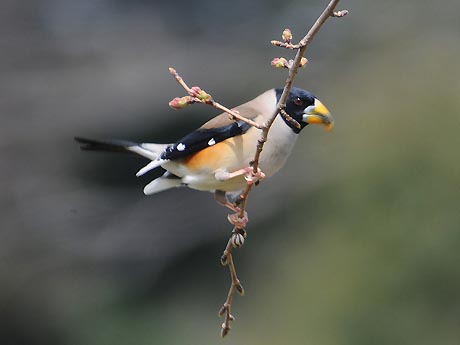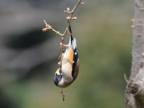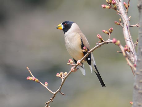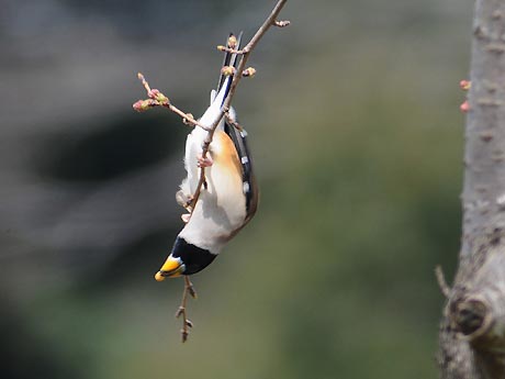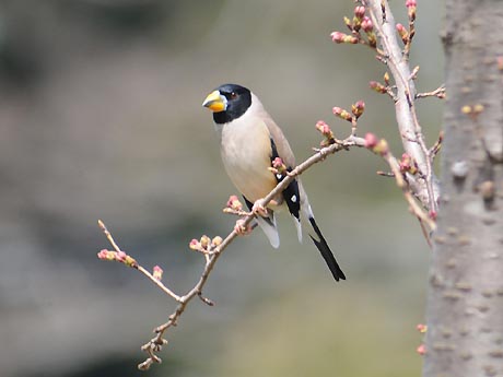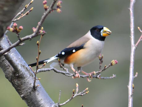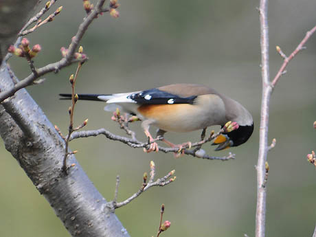 1日目は空模様が優れない中、チャンスを失わないようにと出掛けました。現地到着して5分と経たない内に蕾が 膨らむ桜の木に登場です。盛んに移動しながら10分程の顔見せでした。この後降雨の恐れが出てきたため、やむ なく撤退し、翌日のリベンジを期すことにしました。