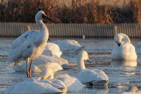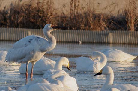 水を張った田圃でコハクチョウに混じって1羽のソデグロヅルが羽繕いをしているのが確認出来ます。