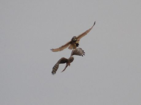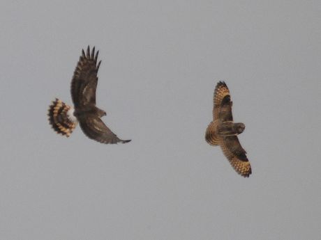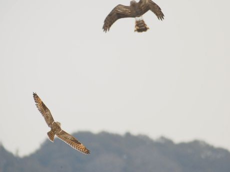 珍鳥の情報などを送って頂いているラーメン屋さん。その最新情報を入手して現場へ駆けつけること3回。やっと姿 を現してくれました。ハイイロチュウヒも出ており、時折バトルを繰り広げます。