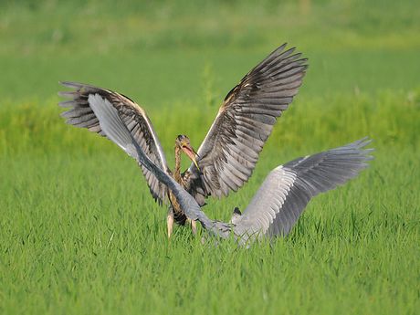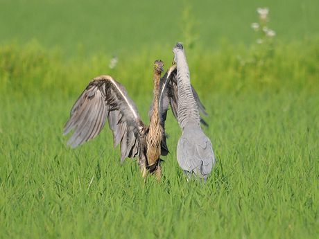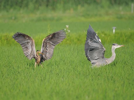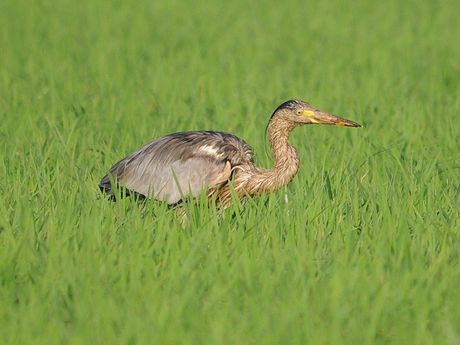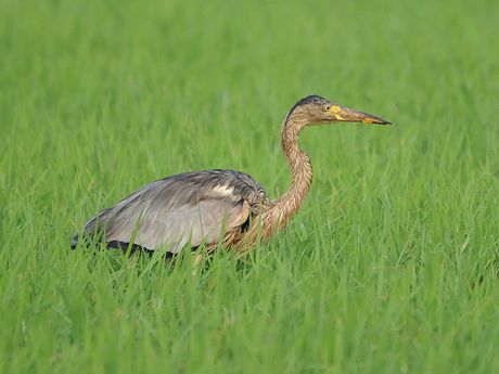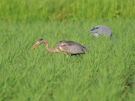 ムラサキサギの若鳥の情報が入ると、すぐに準備を整え現地に向かいます。ポイント到着は17時近くとなり、それ から15分程近くを走り回りました。アオサギの群れに、1羽だけ黒っぽくて一回り小さなサギを見つけて撮影をす ることになりました。