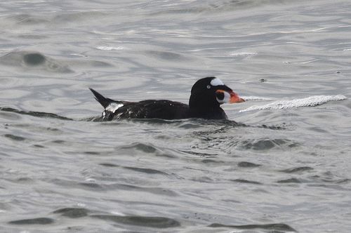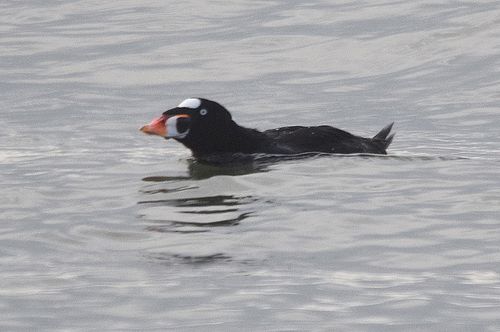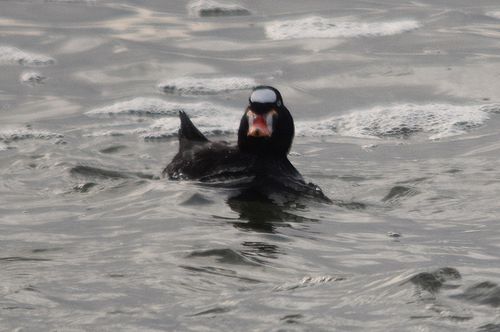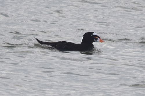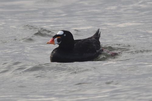 この日やっとチャンスを見つけ、駄目元覚悟で6時過ぎに出発して、現地到着は8時頃でした。カメラマン3名の 姿が見えたため、大急ぎで機材を準備して突堤へ向かいます。10〜15分程でしょうか、クロガモと共にかなり 近くまで寄ってくれました。唯、逆光の位置のため、撮影には少し難がありました。でも昨年の思いをすれば、十 分過ぎる程の収穫がありました。