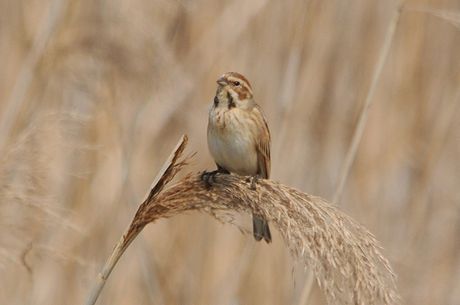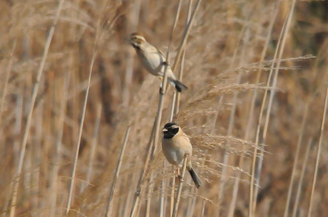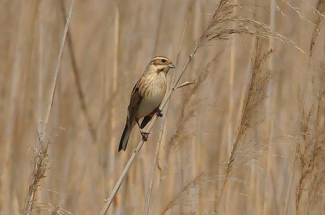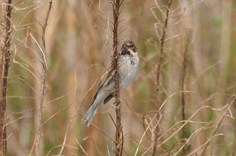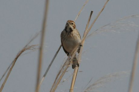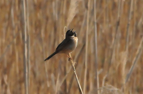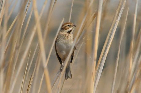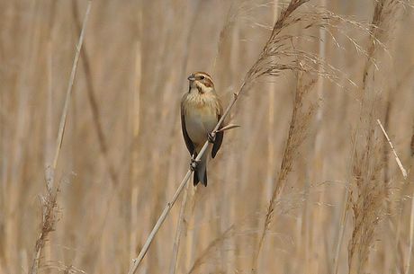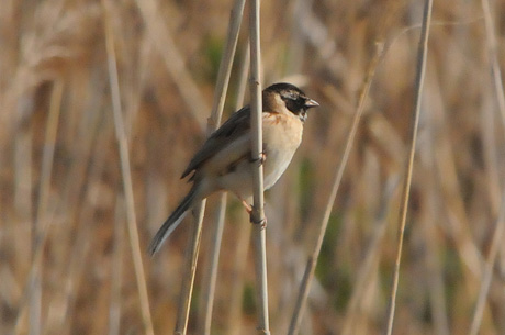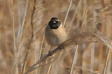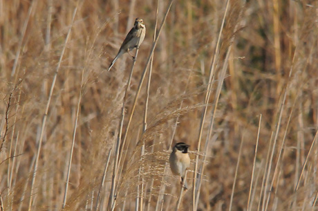 今回は葦原をメーンに観察することにしましたが、3月28日時点では当地で冬鳥の「オオジュリン」が数多く 残っており、「コジュリン」は未だ数多くはありません。「オオジュリン」の中には頭の黒くなりかかったもの も見られます。3月29日には「コジュリン」の夏羽の姿もかなり見受けることが出来ました。また「オオジュ リン」とのツーショットも見られました。