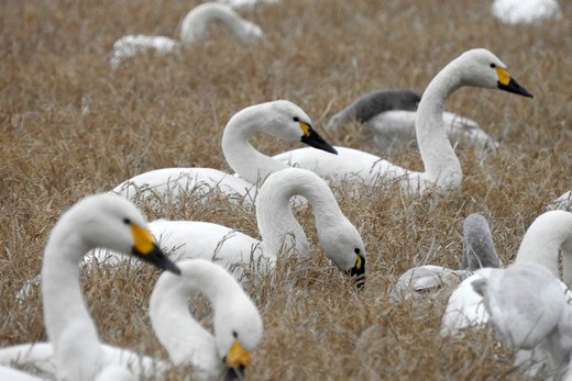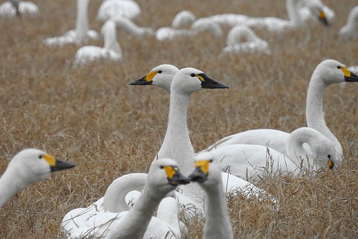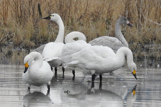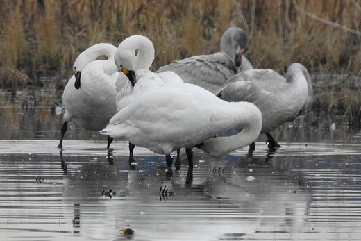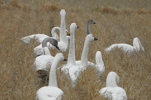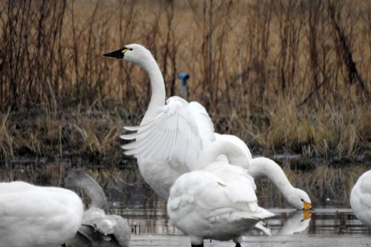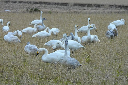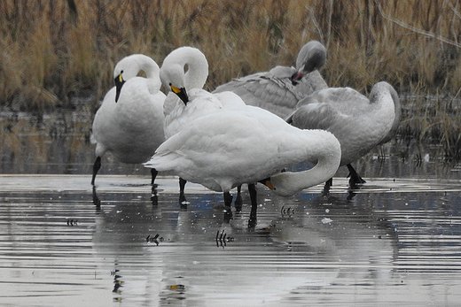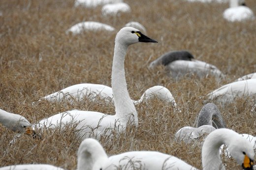今年も冬の使者コハクチョウがMFの越冬地へ入りました。15日時点での概数は800羽を超えるほどになってい ました。マガンも入っているようですが、私は現時点で確認できていません。亜種アメリカコハクチョウはその数を 増やしているようです。嘴基部の黄色い部分の大きさがまちまちなのは個体差か、それとも別亜種コハクチョウとの 交雑種なのでしょうか?