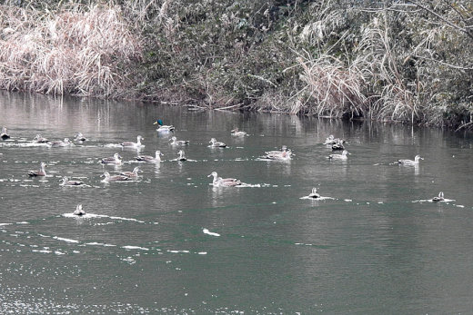 普段は数羽のカルガモがいるだけの堰に、狩猟解禁で川辺を追われたカモ類が多く入ったようです。