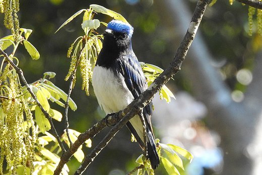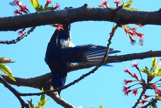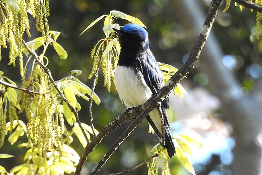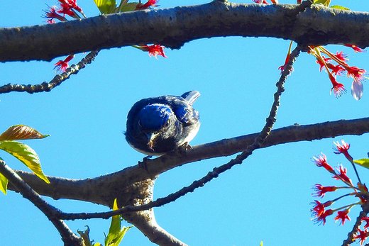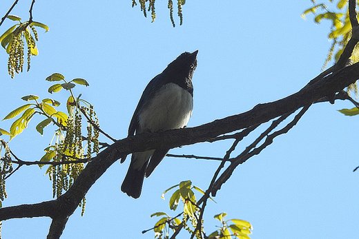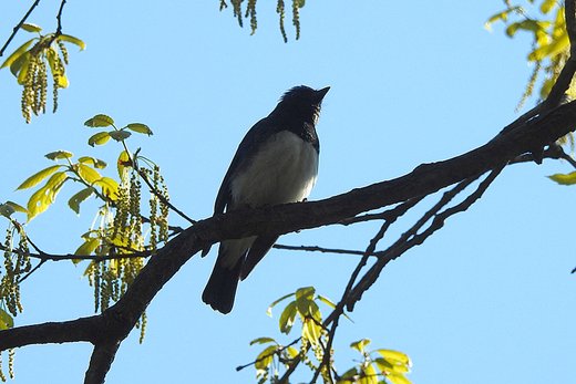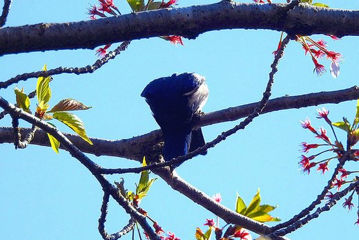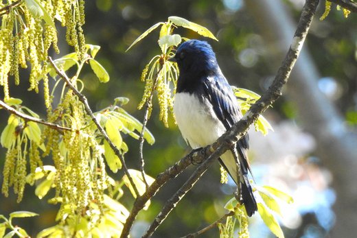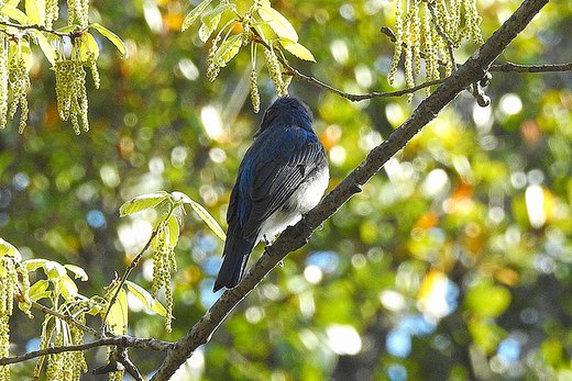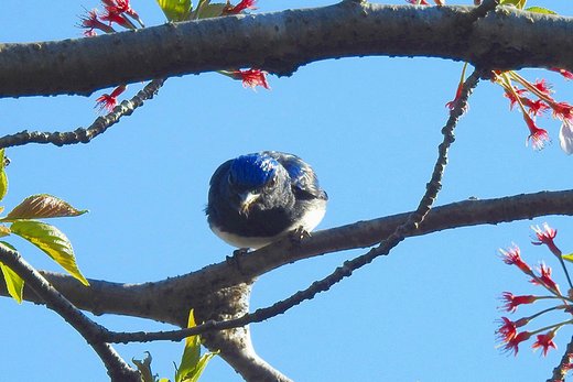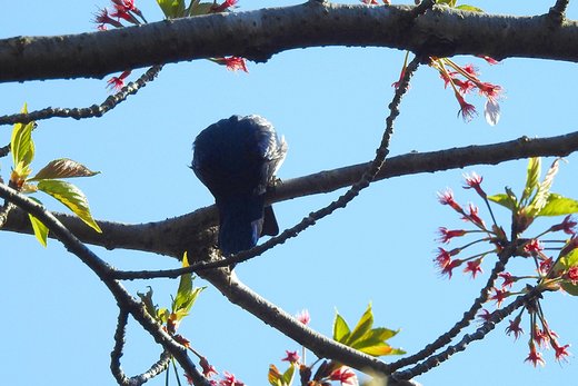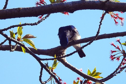 翌朝6時過ぎより探鳥を行いましたが、なかなか出現してくれません。8時になる頃10mと離れていない場所へ飛 来した鳥影が目に入りました。静かに回り込んで探すと、オオルリの雄が間近に止まっています。逆光気味で5分足 らずの時間でしたが、何とか撮影が叶いました。桜の樹木では、虫を啄ばむ場面も撮れました。