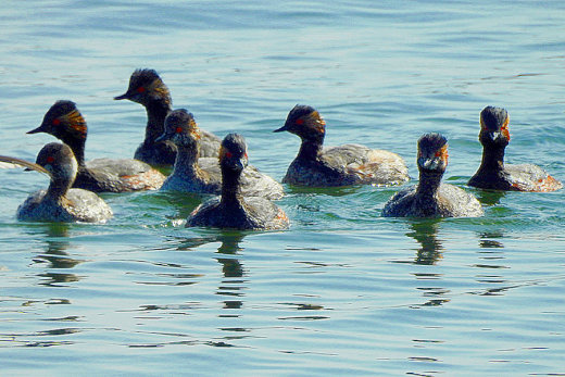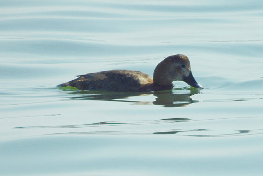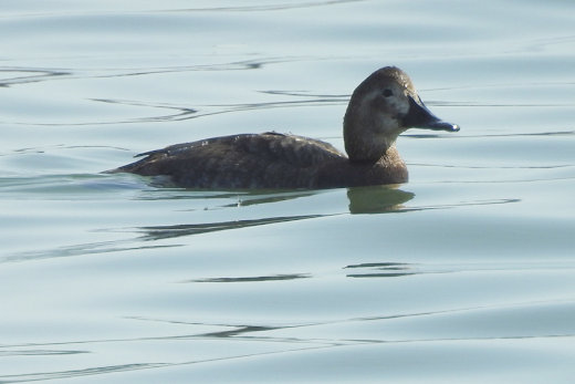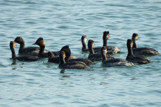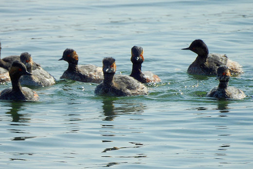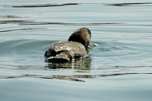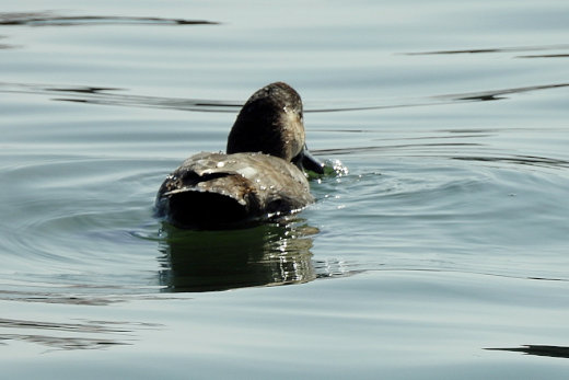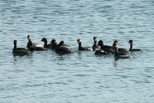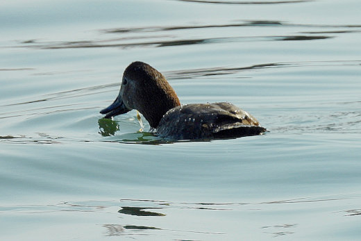 新港の広範囲を見渡しても、海鳥はほとんどみあたりません。場所を移動しながら旧港へ向かう途中で、逆光 の中に嘴の長いホシハジロらしき姿が見えました。近くで車を止めて確認すると、数日前に情報を耳にしてい たオオホシハジロの♀に違いありません。無理を承知で撮影していた処、近くに夏羽のハジロカイツブリ10 数羽が現れました。