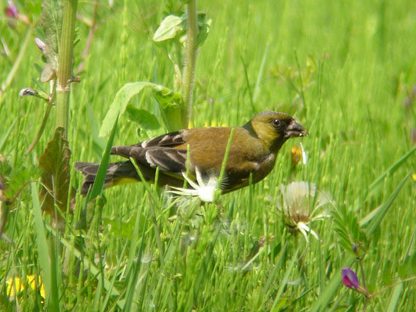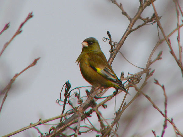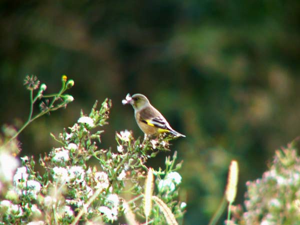 特 徴 :L14.5cm 体はオリーブ褐色で、風切は黒く基部が黄色いので飛ぶと幅の広い黄帯が出る。三列風切の外縁は灰白色。雄の頭部に