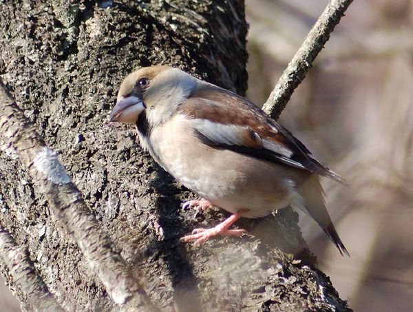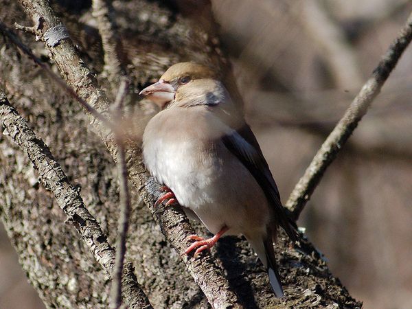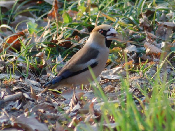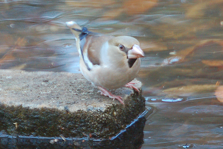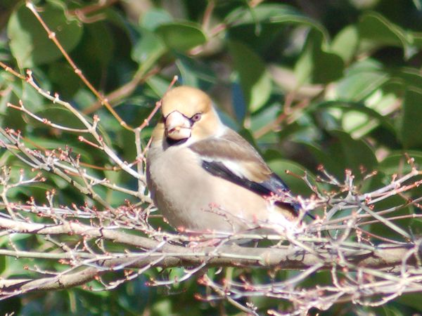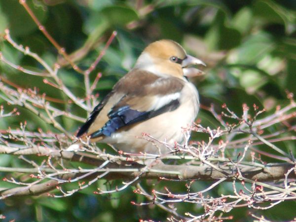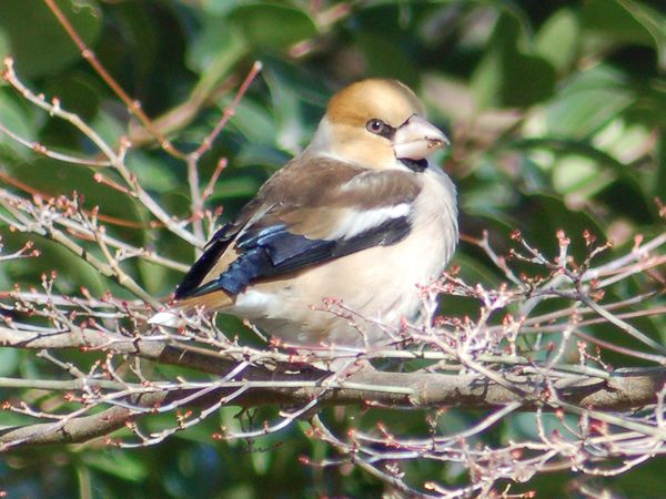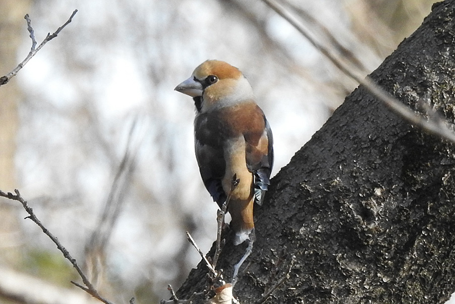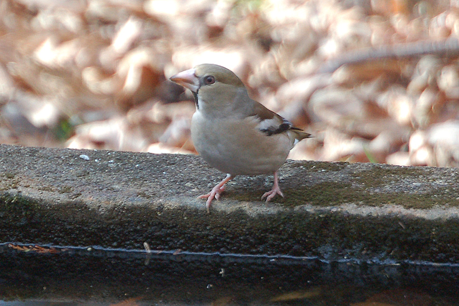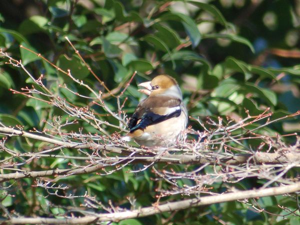 特 徴 :L18cm 太っている。イカルより尾は短い。雄の頭上と頬は茶褐色、後頭と頸側は灰色、背は暗褐色。翼は青黒色で初列風切基部と