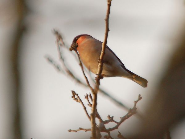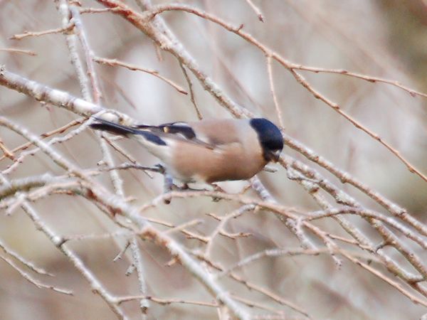 特 徴 :L15.5cm 嘴が短くて太い。雄の頭上は黒く頬と喉は紅色、嘴の大部分は黒く、大雨覆の先端ははいはくしょく、腰は白色。体の