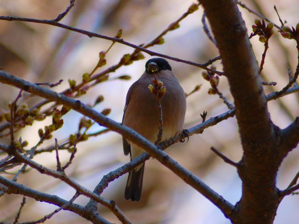 実を食べる。桜や梅の花芽も好むので、公園にも来る地方がある。