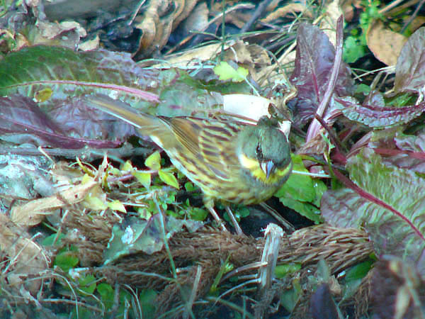 特 徴 :L16cm 雄の頭上と頬は緑灰色で、目から嘴の基部は黒味が強い。背は緑灰色で黒い縦斑があり、腰は茶褐色。翼には2本の淡色