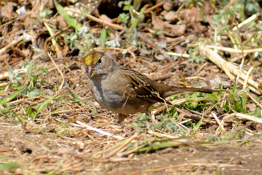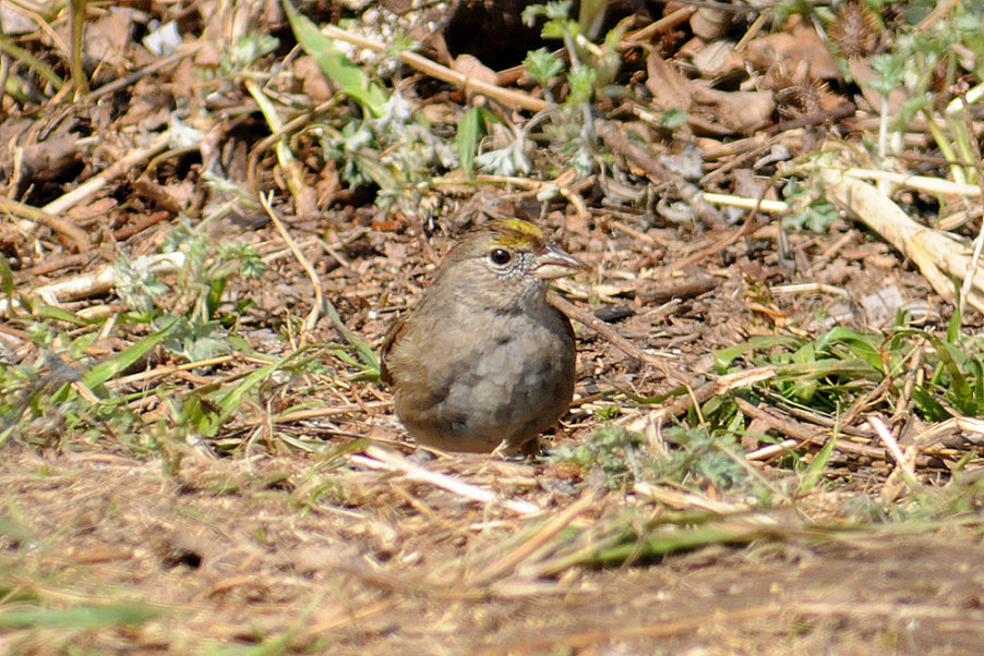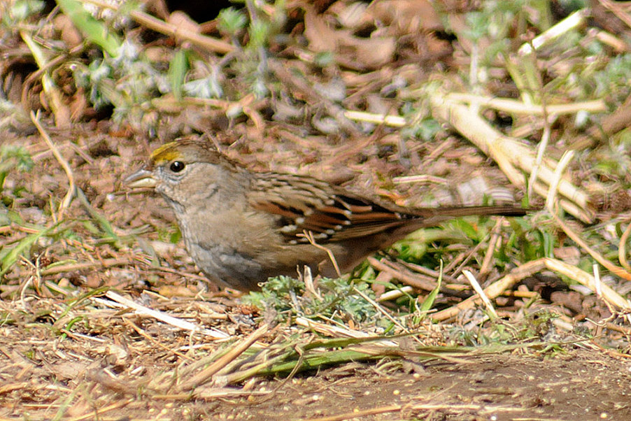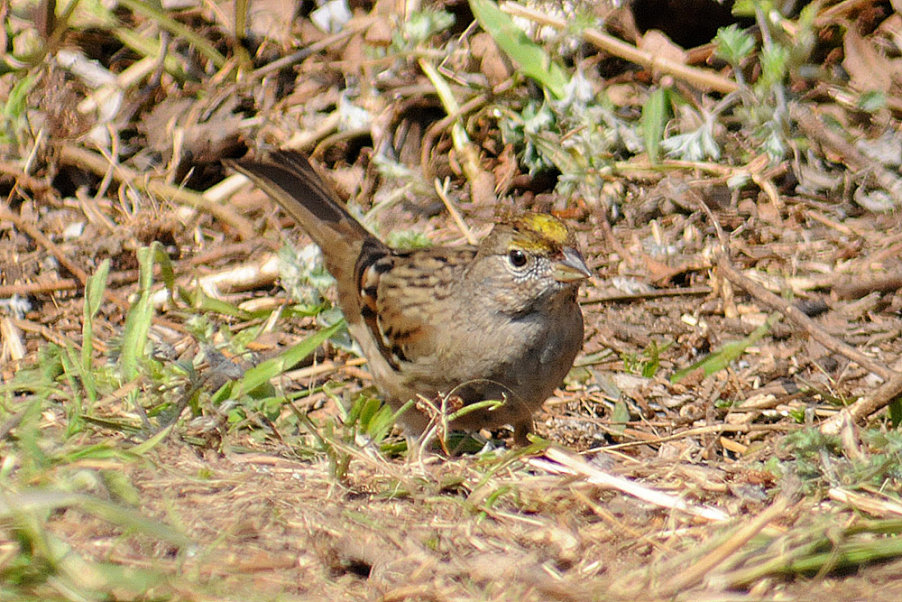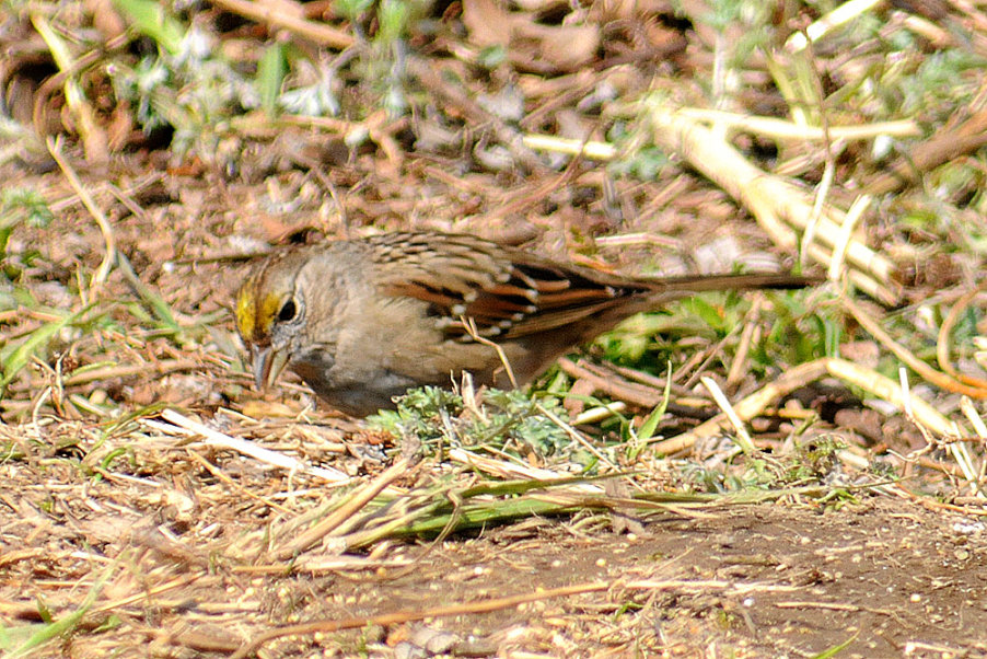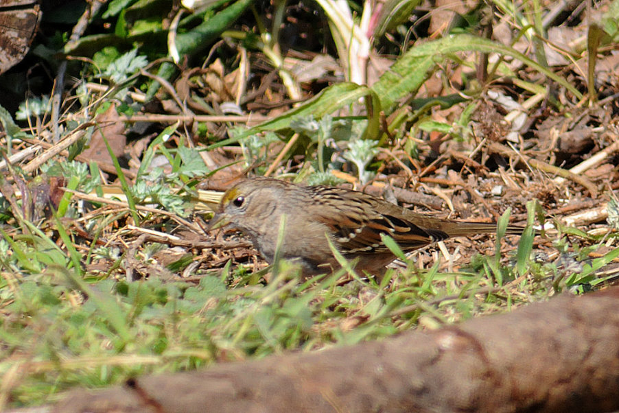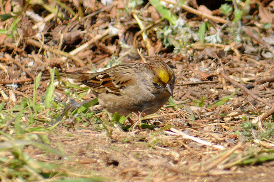 特 徴 :L16cm 額から頭側線、後頭と続いて黒く、頭上は黄色。背は赤褐色で黒い縦線があり、翼は黒褐色で赤褐色の羽縁があり、と中