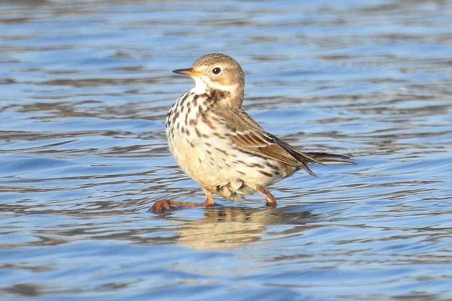 いバフ色、耳羽灰褐色、下面は淡い橙赤色でわずかに黒い縦斑がある。足は黄褐色。冬羽では上面がオリーブ褐色で下面は汚白色、顎