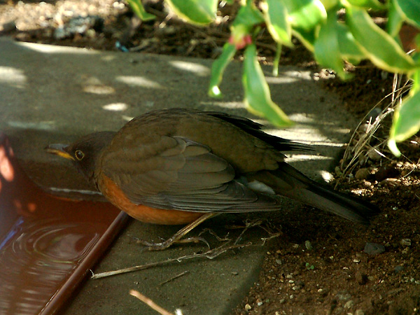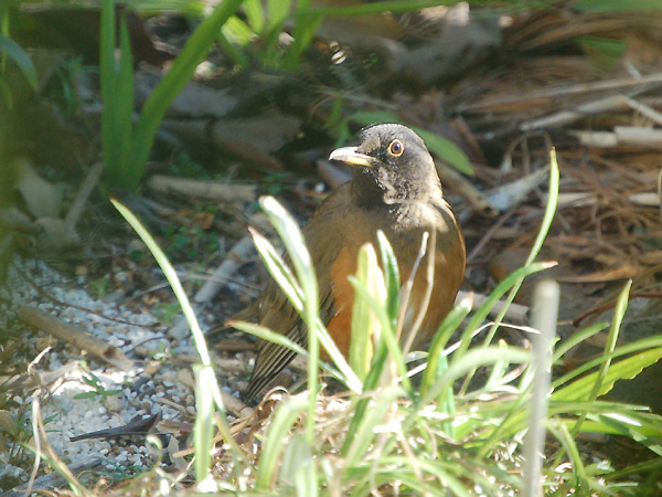 この冬に我が家で初めてアカハラを見かけました。警戒心が強くてなかなか写真が撮れませんでしたが、 庭に屑米を撒き水場を作った処、終日庭にいるようになりました。写真はサンルームのサッシ越しに一眼 デジ(200mm)で撮ったものです。