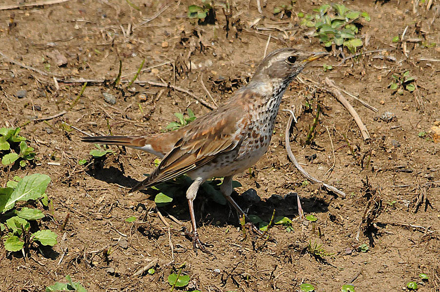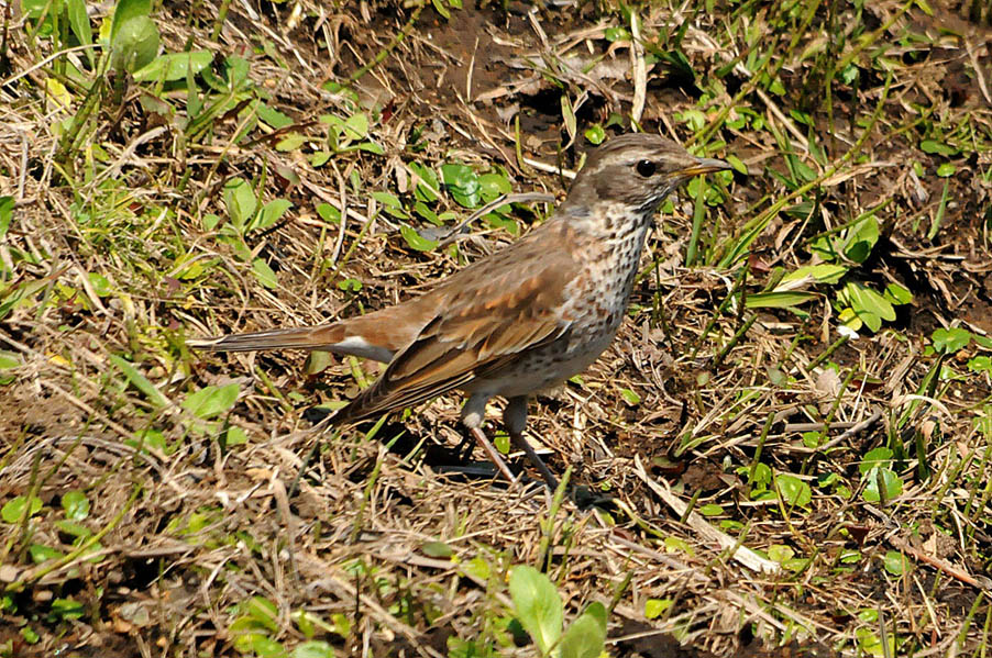 で、翼には栗色の羽縁はなく、尾は殆ど赤褐色。眉斑は淡赤褐色、頬は灰黒褐色、喉は淡赤褐色。胸から脇には赤褐色の斑点が密に並