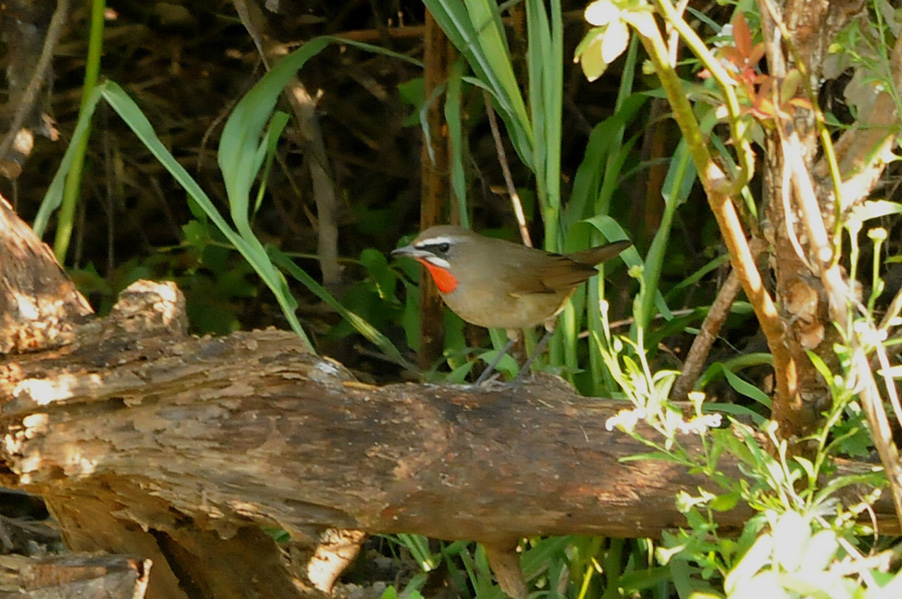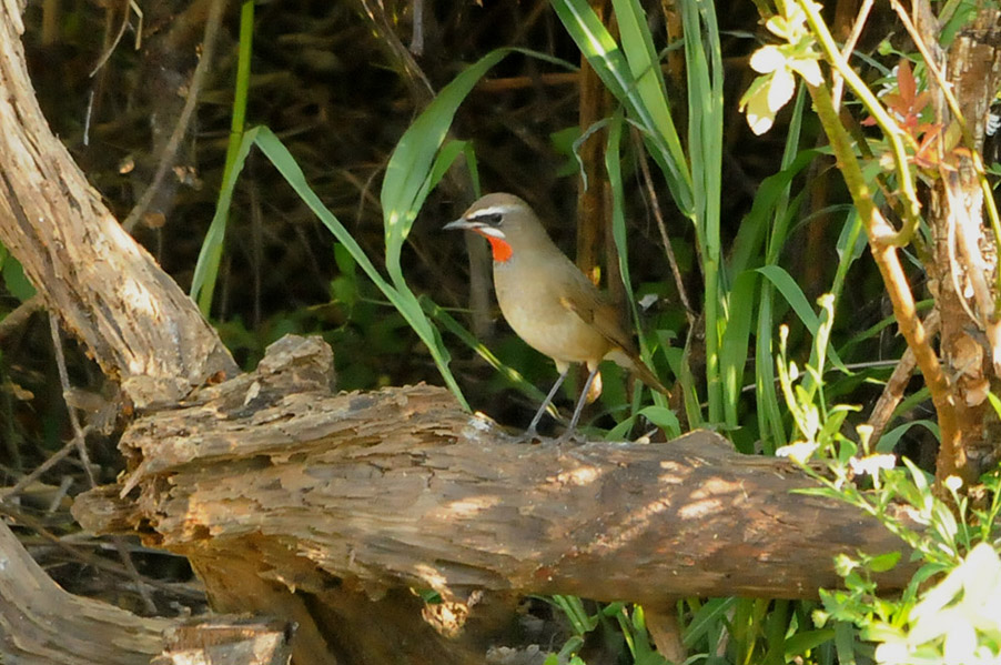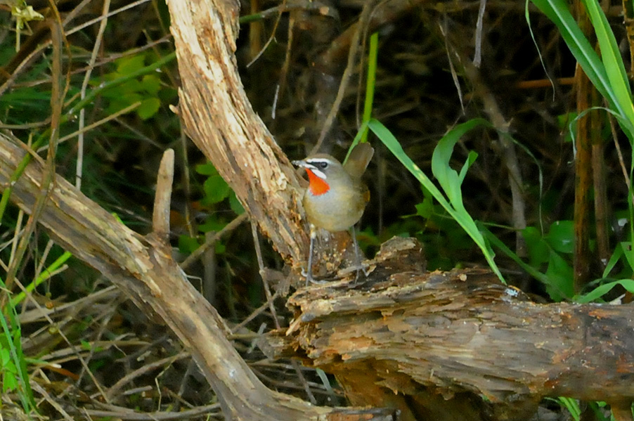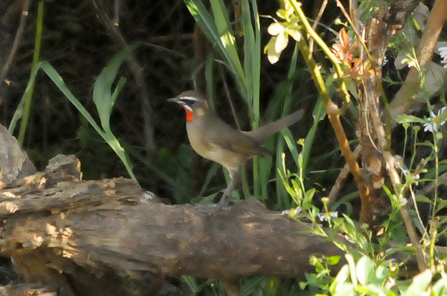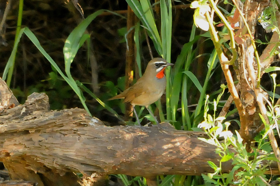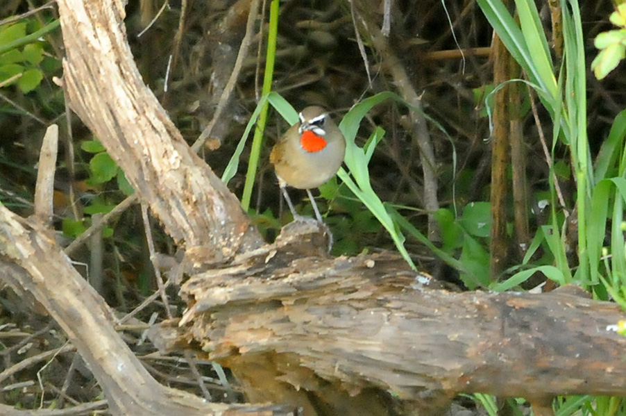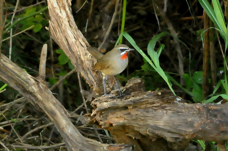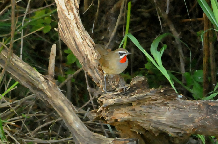 特 徴 :L15.5cm 体の大部分はオリーブ褐色で、下面は淡色。白い眉斑と顎線が明瞭。雄の喉は赤くて雌の喉は白いが、少し赤味を持つ