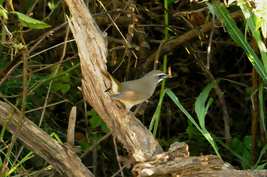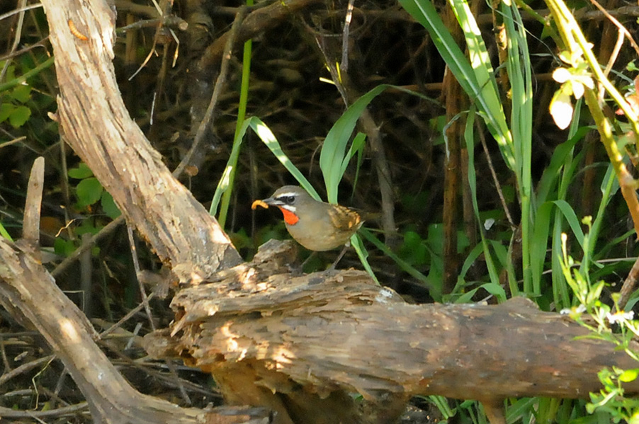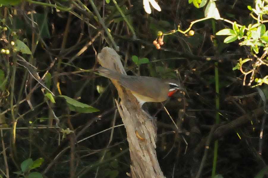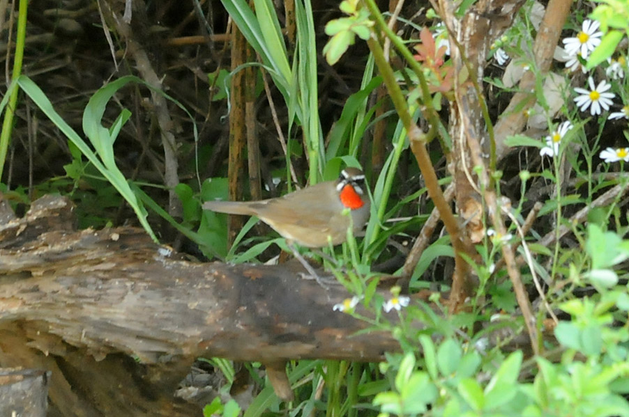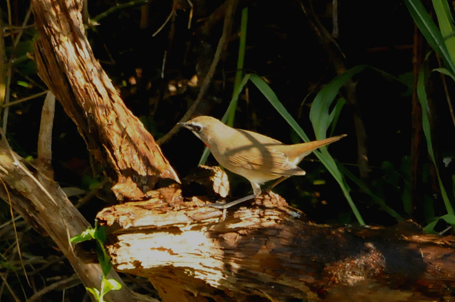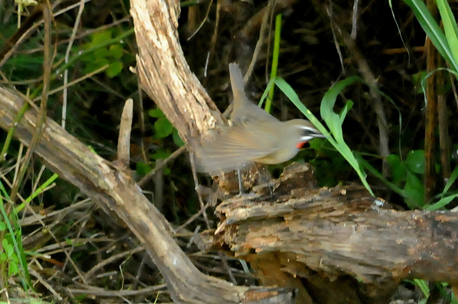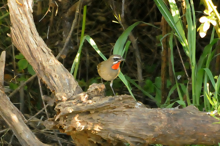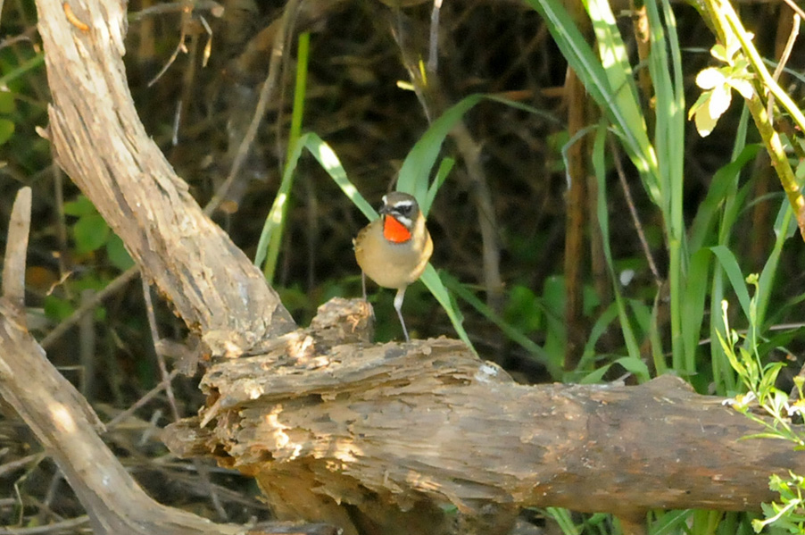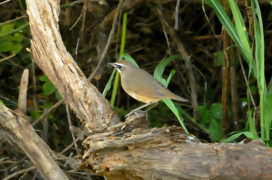 特 徴 :L15.5cm 体の大部分はオリーブ褐色で、下面は淡色。白い眉斑と顎線が明瞭。雄の喉は赤くて雌の喉は白いが、少し赤味を持つ