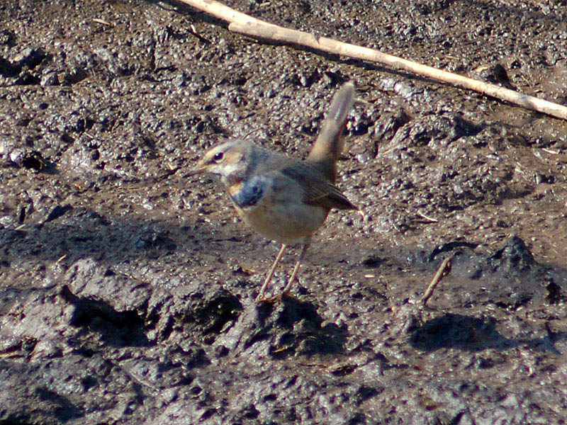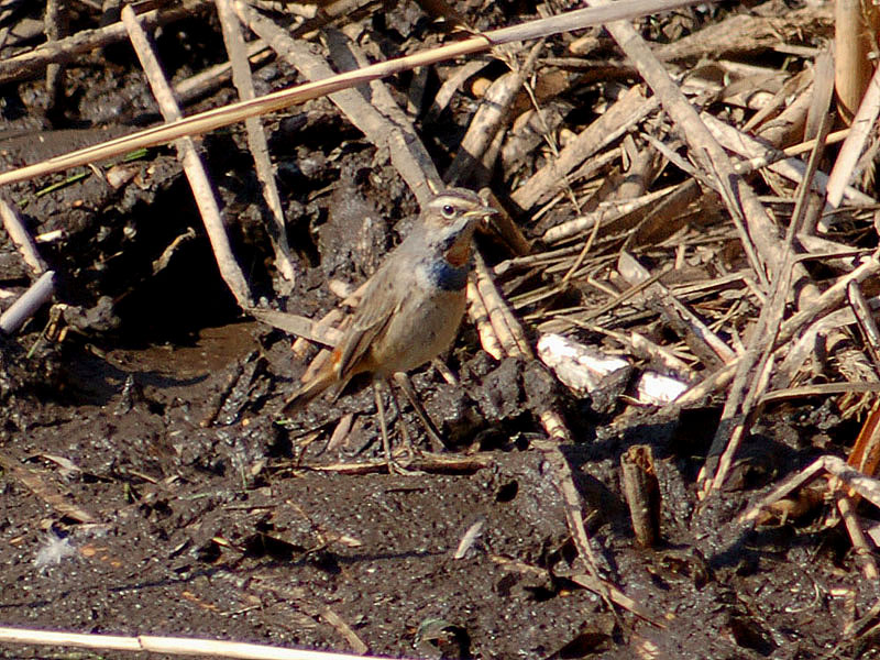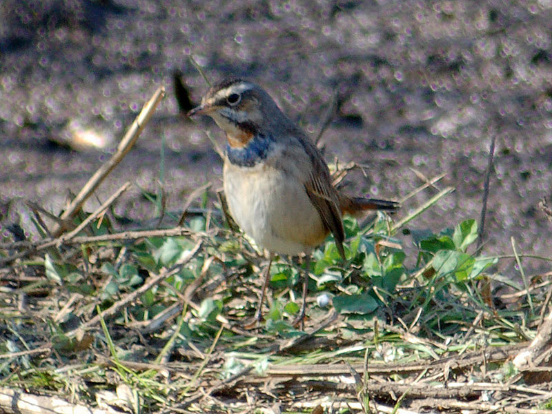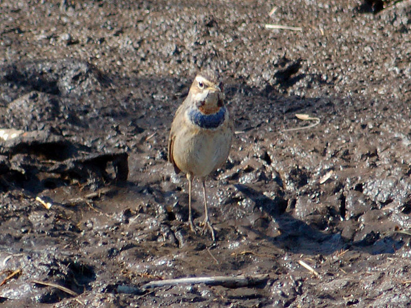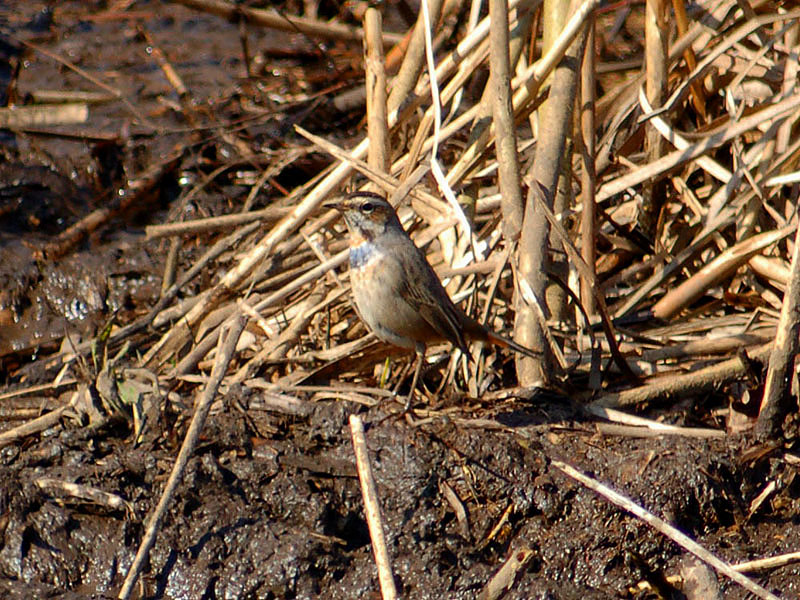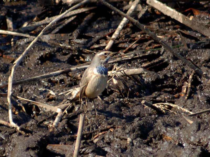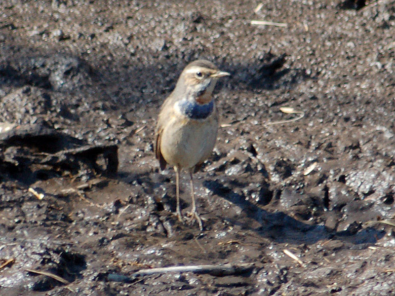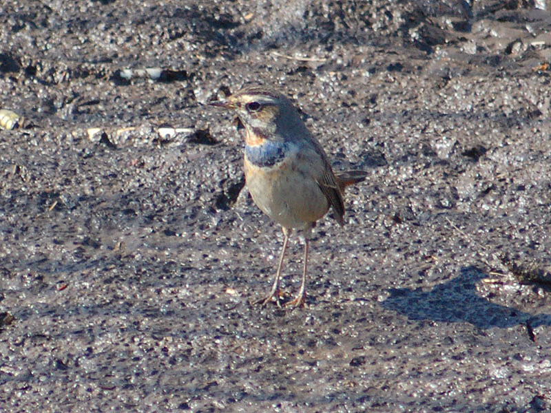 くて茶褐色の斑があり、腹部との境に、黒、白、茶褐色の横帯がある。腹は汚白色、脇はバフ色。冬羽では喉の上部が白くて青い顎線