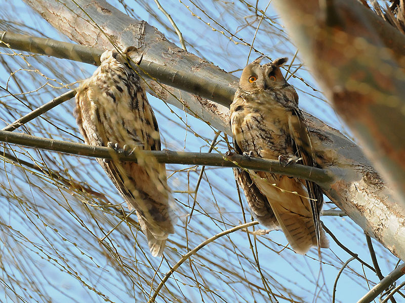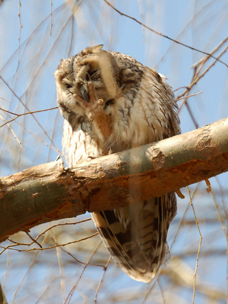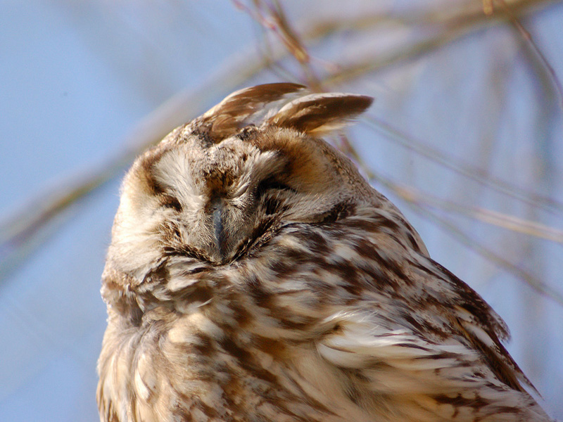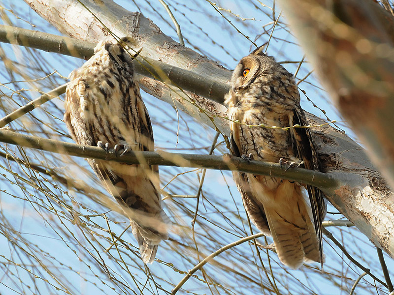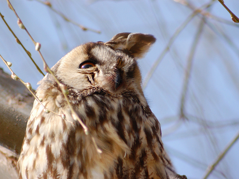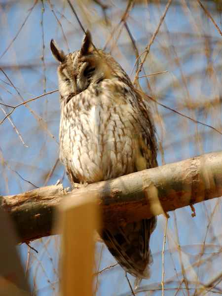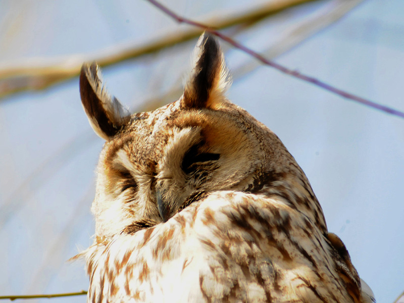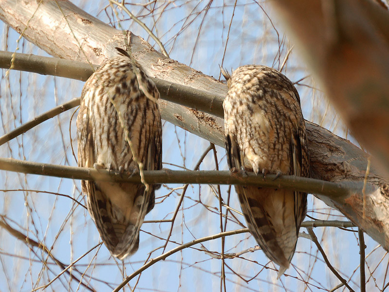 すっかりと晴れて、良好な探鳥日和となりました。トラフズクは3羽、同じ柳の木に止まっています。目を開ける