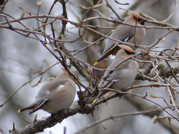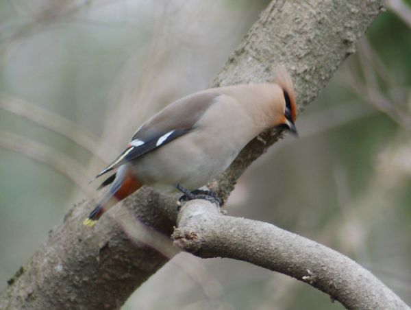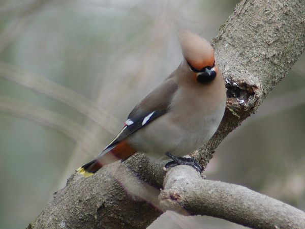 類 似 種:ヒレンジャクは少し小さく、初列雨覆先端と次列風切先端の2ヶ所に白斑がなく、尾の先が赤色。腹の中央が黄色く、下尾筒は赤