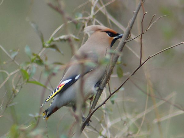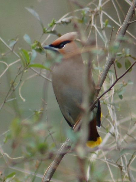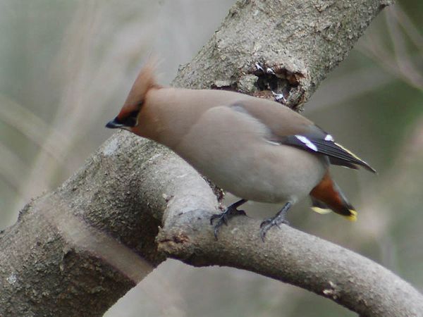 特 徴 :L19.5cm ヒレンジャクによく似ているが、翼には2ヵ所に白斑があり、尾の先は黄色。腹の中央は灰褐色で、過眼線は冠羽の