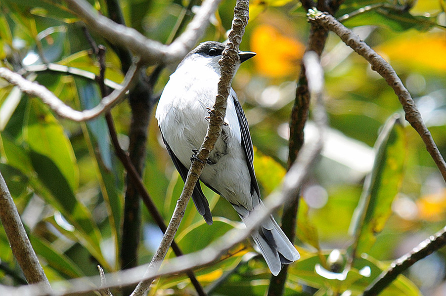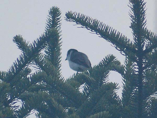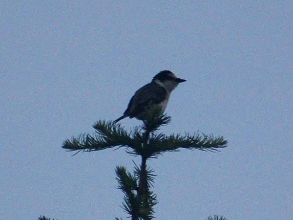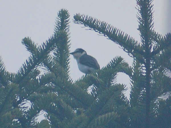 日光の一泊ドライブで霧降高原のペンションで宿泊の翌朝早朝から付近の散策を楽しんでいた時に見かけた野鳥を、 何気なく撮っていました。ヒヨドリか何かと思っていたのですが、2年近く経って改めて見直してみると、どうやら サンショウクイのようです。日の出前で霧も出ていたこともあり証拠写真にもならない程度のものですが、初見初撮 りのため掲載することにしました。