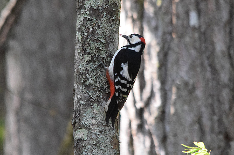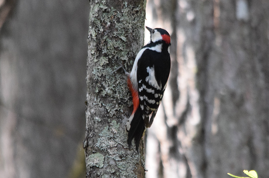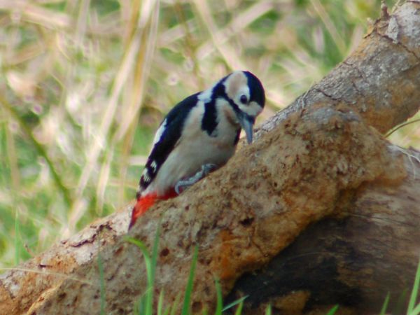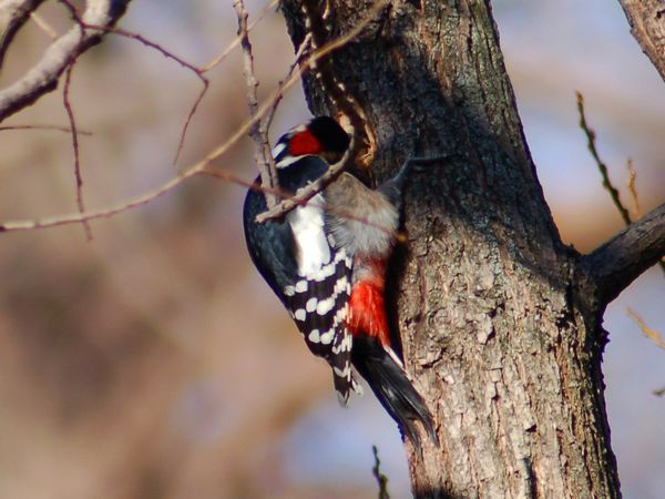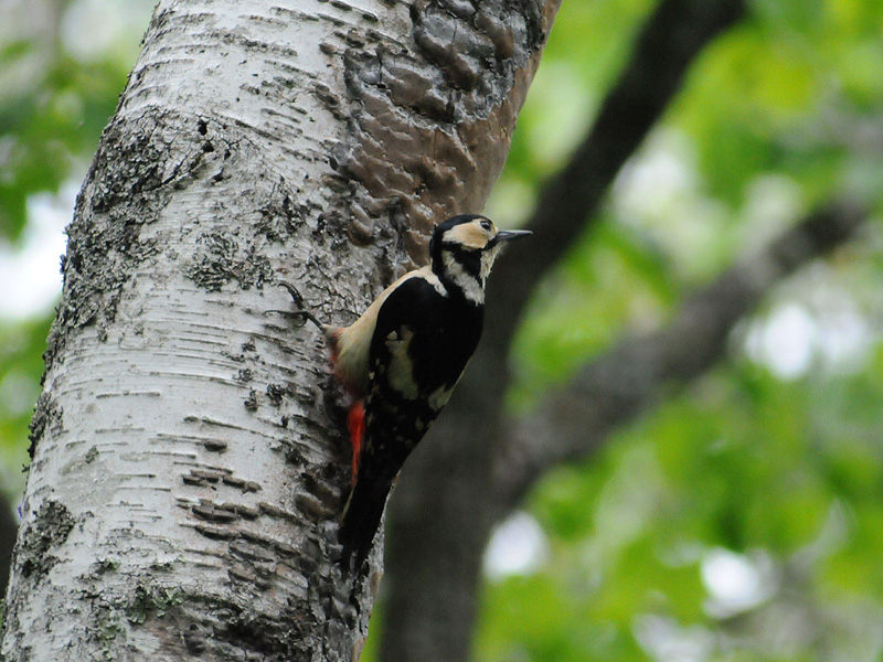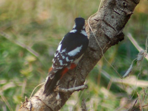 特 徴 :L23.5cm オオアカゲラより少し小さくて、嘴は比較的短い。背から中央尾羽は黒く、外側尾羽は白くて黒い横斑があり、肩羽