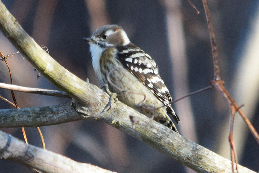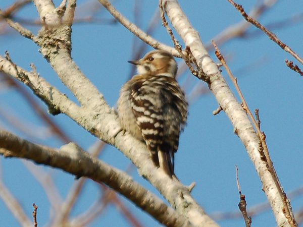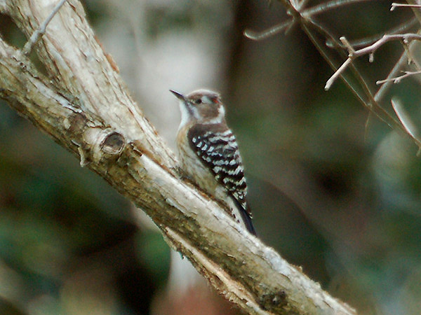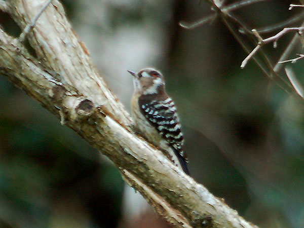 特 徴 :L15cm ほぼスズメ大の小さなキツツキ。頭上から体の上面は黒褐色で背と翼には白色の横斑がある。体の下面は汚白色で、目か