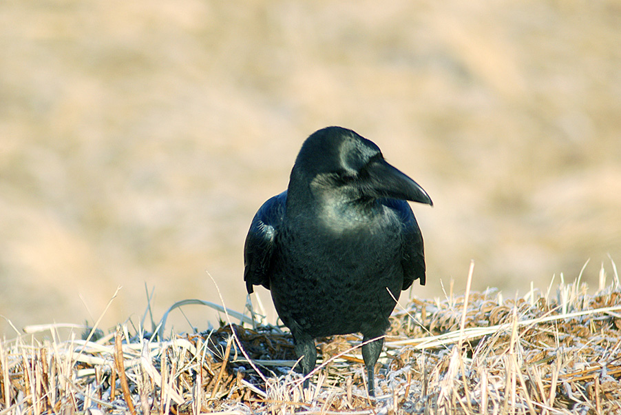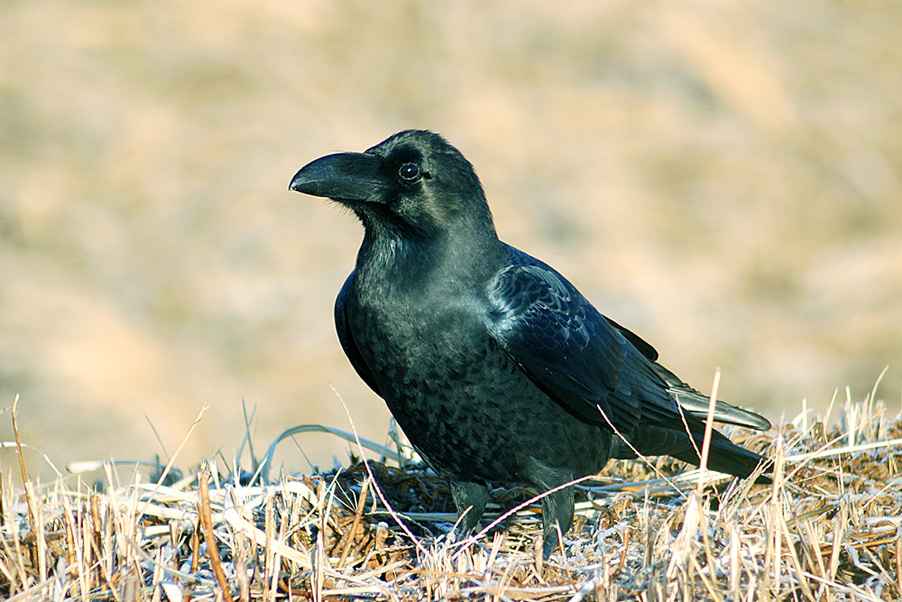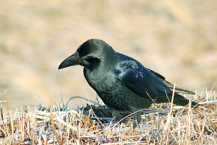 特 徴 :L56.5cm ハシボソガラスより大きく、額が出っ張り、嘴は太くて、著しく湾曲している。全身が青色光沢のある黒色で、幼鳥