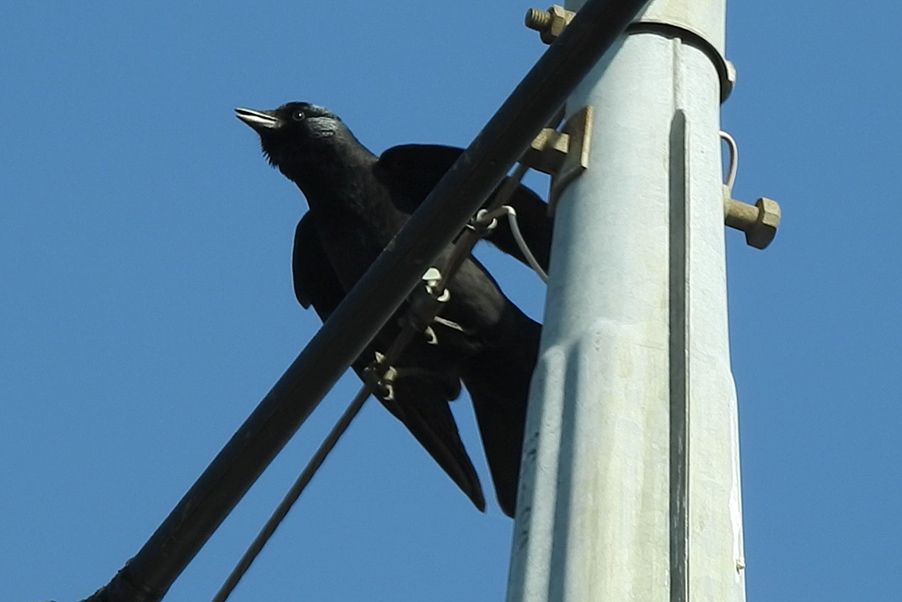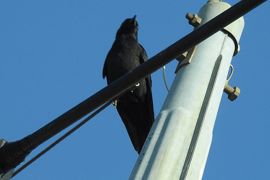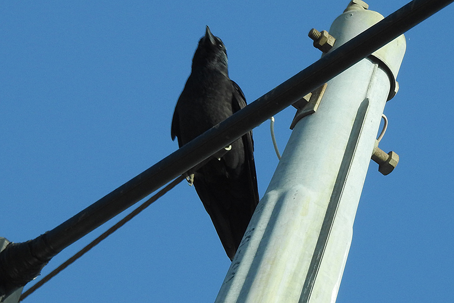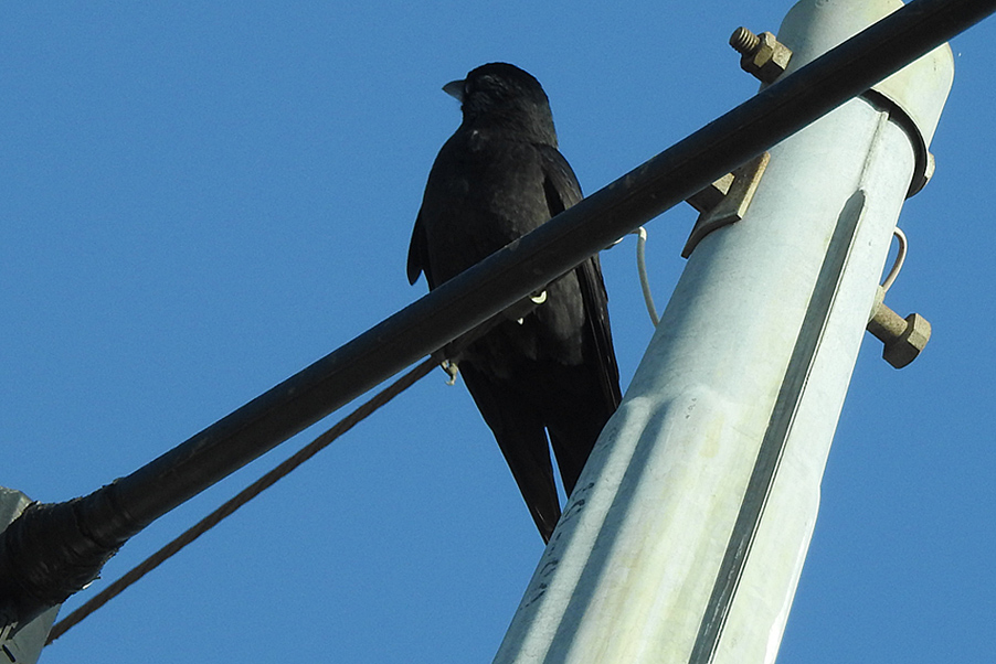 類 似 種:ニシコクマルガラスは、虹彩が、銀白色。胸側から側頭にかけて白斑がある。