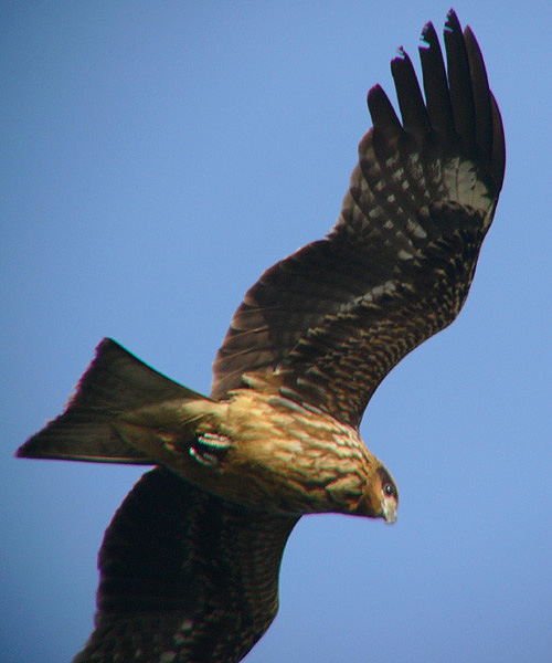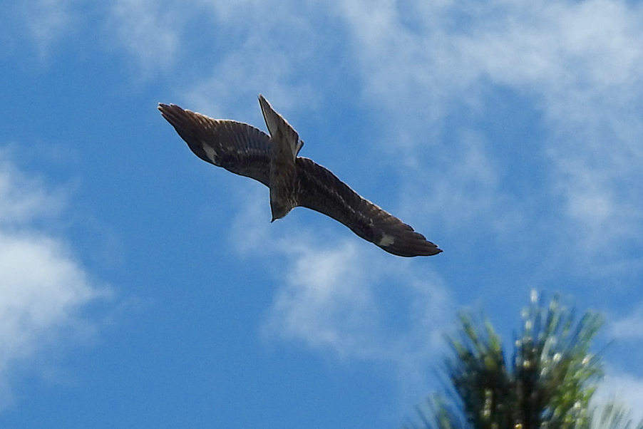 急いで車を安全な場所に止めて、夢中で撮った飛翔中のトビです。フレーム内に収めることとピントを合わせるのが 大変でしたが、予想以上のアップで撮れたことに満足しています。