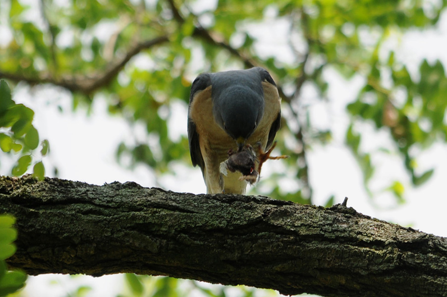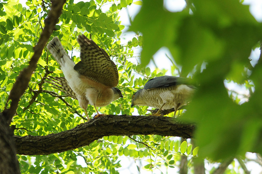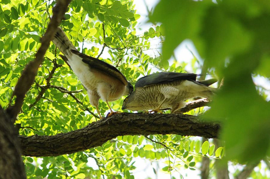 現地で地元の人の話によると、2羽は孵化したとのことでした。雌は抱卵・育雛のため、巣から離れられない ようです。雄は採餌した小鳥(ムクドリかヒヨドリ)を、少し離れた樹の枝で羽を毟ったうえで雌に合図を送 りますが、なかなか餌を受け取りに来てくれません。2時間ほど経った頃でしょうか、やっと雌が餌を受け取 り巣に戻りました。その時の様子を撮りましたが、思うようには表現出来ませんでした。