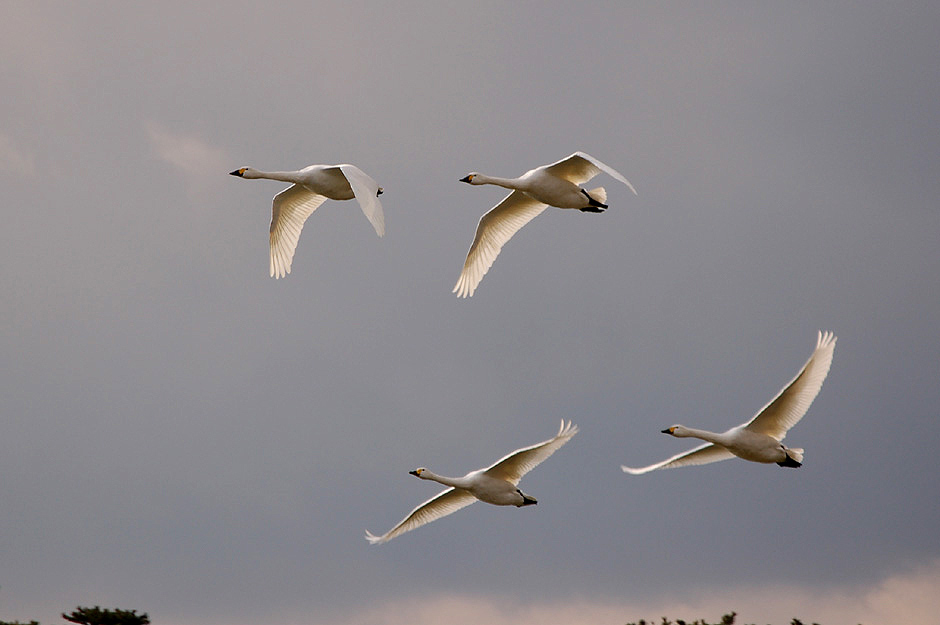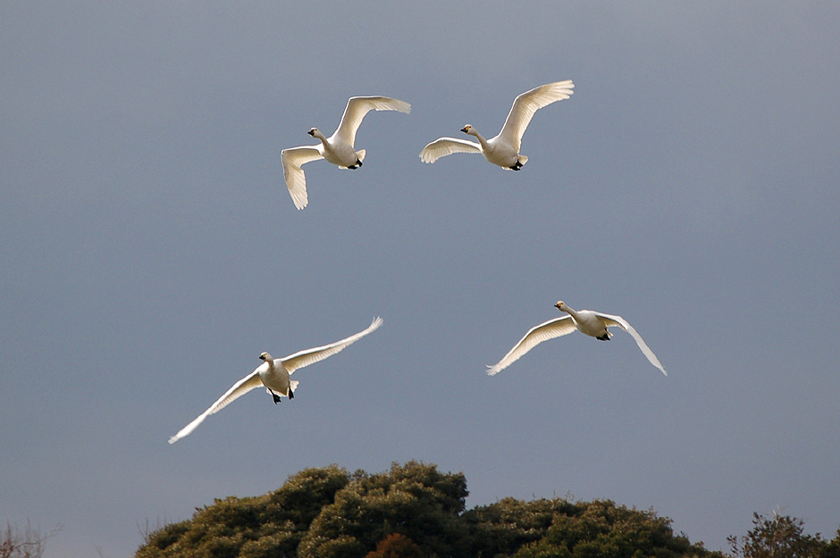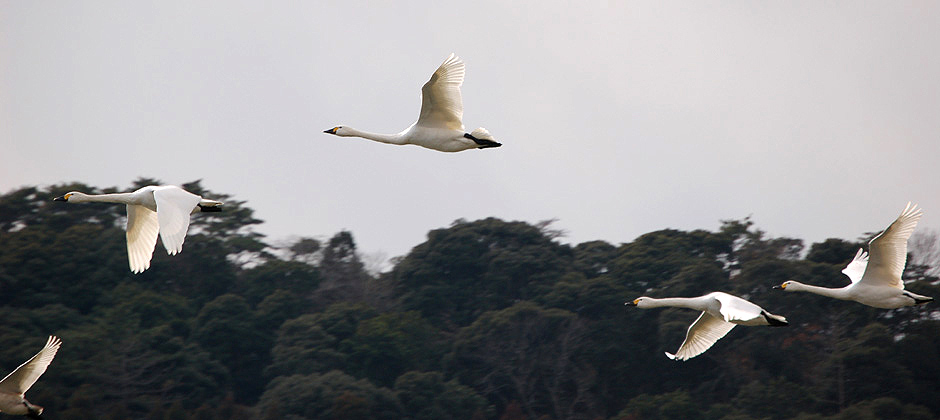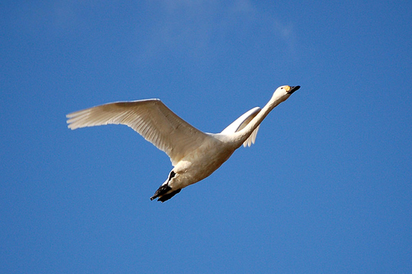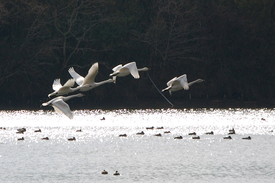 特 徴 :L120cm オオハクチョウより少し小さいが、よく似ている。全身が白色だが、頭からくびは黄褐色に染まっているものが多い。