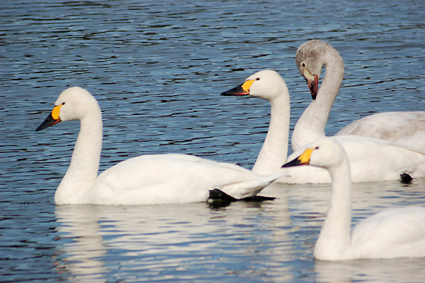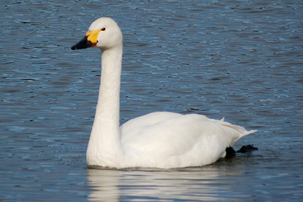 類 似 種:オオハクチョウは少し大きくて、嘴の黄色部の先は尖っている。