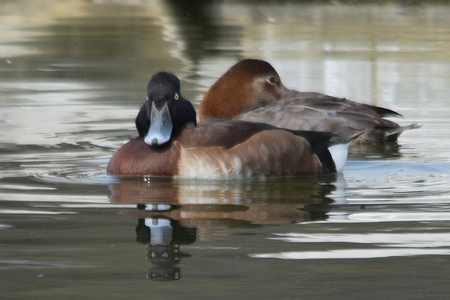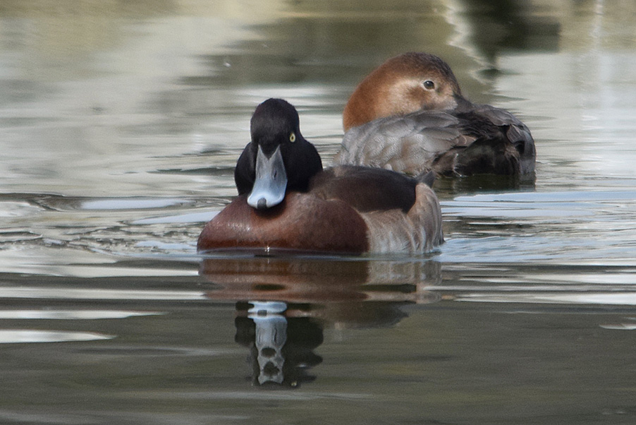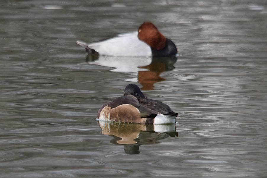 類 似 種:スズガモの雄は胸が黒くて背は灰色、雌は褐色味が少なく、嘴の基部が白い。キンクロハジロの雄は胸が黒くて冠羽があり、脇は