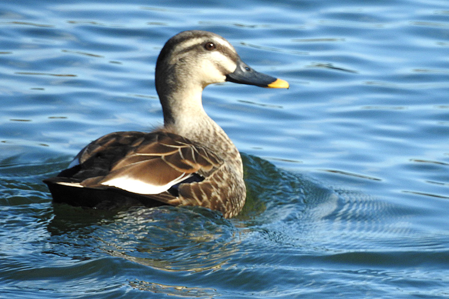 特 徴 :L60.5cm 他のカモと違って雌雄同色。体は褐色で黒褐色の斑があり、。顔は淡色で特徴のある2本の黒線が走る。体の後半程