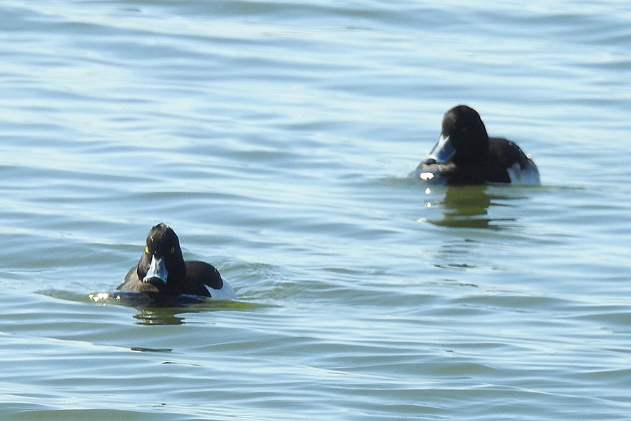 く、白い。クビワキンクロの雄は長い冠羽はなく、胸側の白い縦線が目立つ。翼帯は灰色。クビワキンクロの雌はめの周囲に白い線
